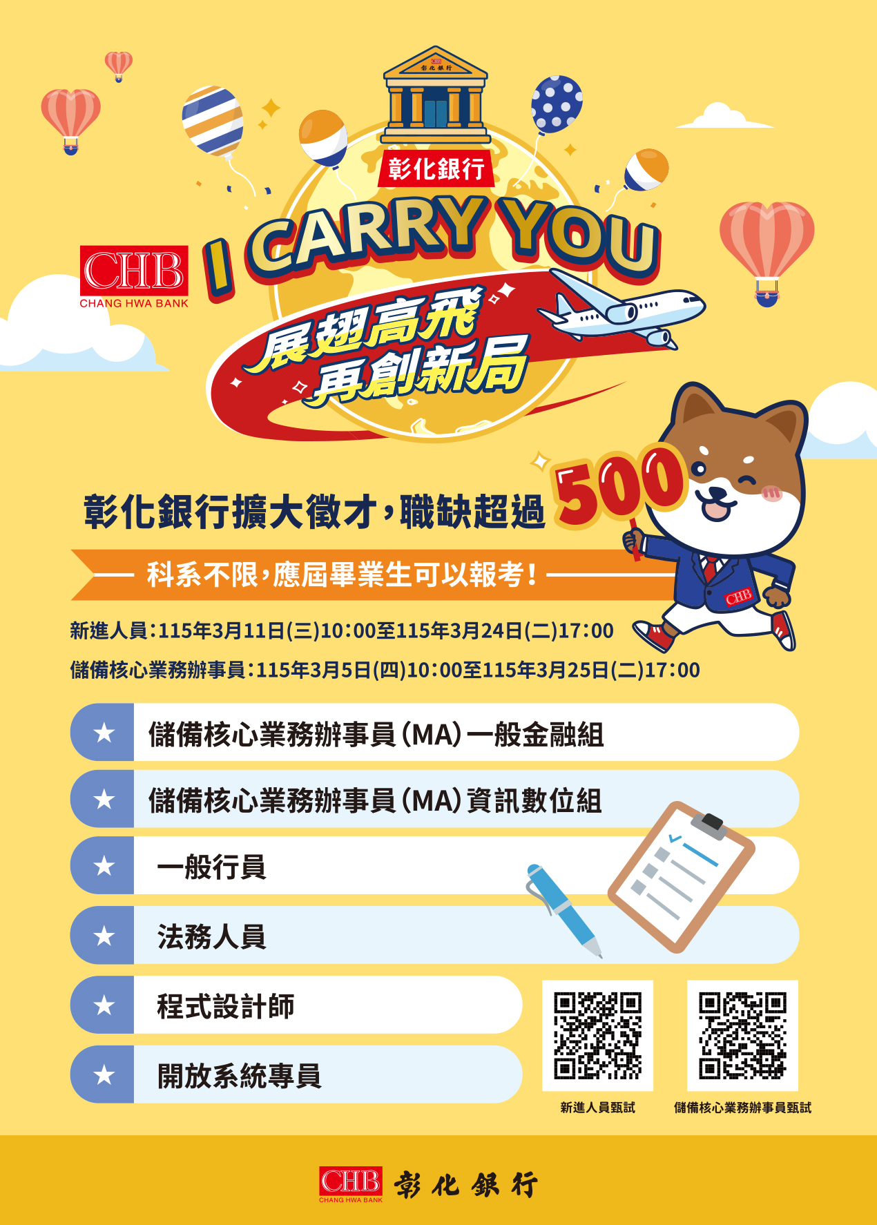 彰銀以「展翅高飛 再創新局」為核心,積極擴大校園徵才規模,自3月2日起展開全台校園巡迴說明會,並陸續參與三場徵才活動,本次徵才計畫釋出11類職缺,更首度推出「新進人員獎勵金」制度,搭配業界具競爭力的薪資待遇,展現彰銀深耕人才培育、強化員工福祉的決心。