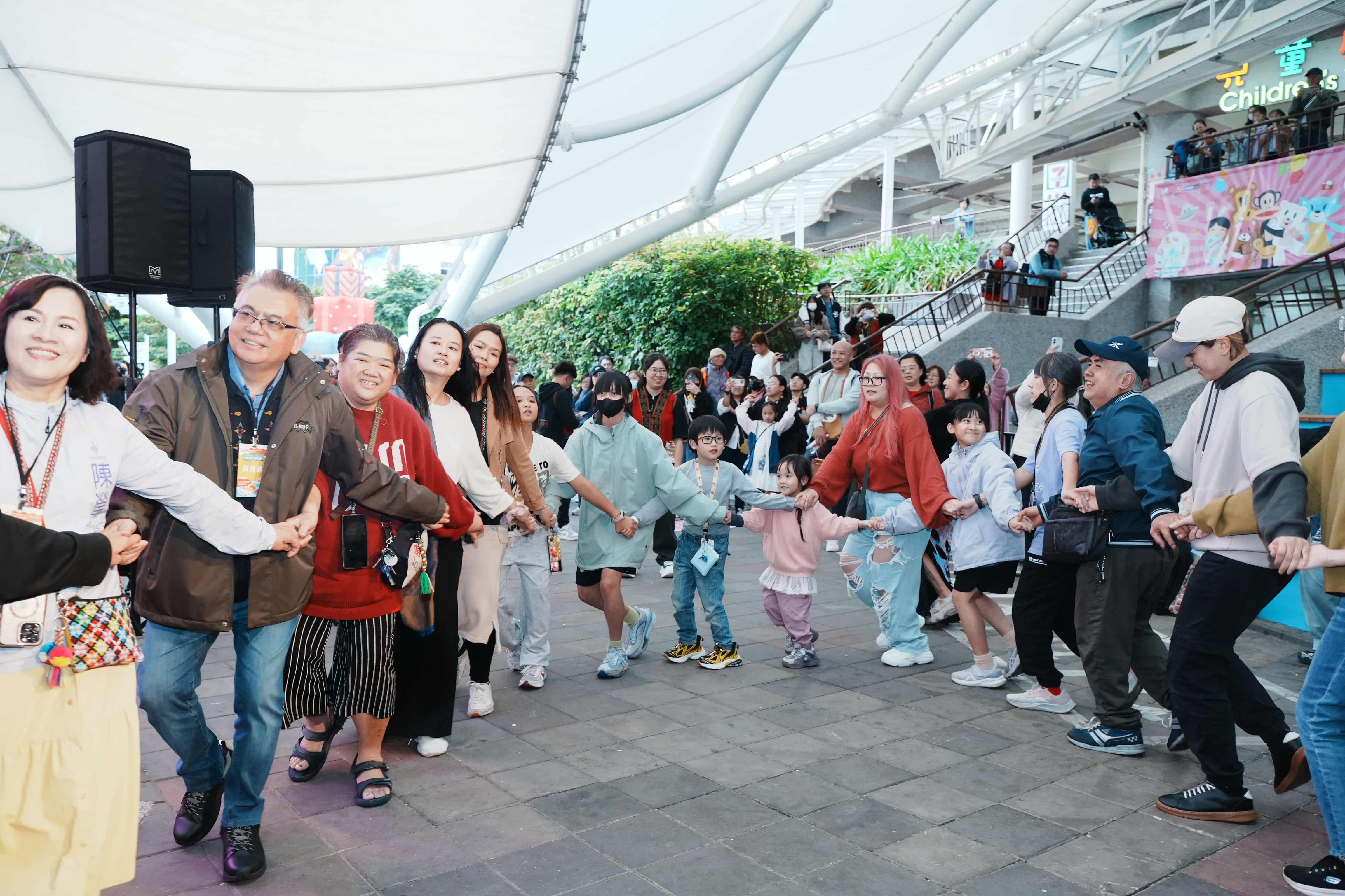 圖說:原語會董事長俄鄧‧殷艾手牽手與群眾、親子一同跳起大會舞,象徵族語與文化的接力傳承,在遊戲與歡笑中自然紮根。