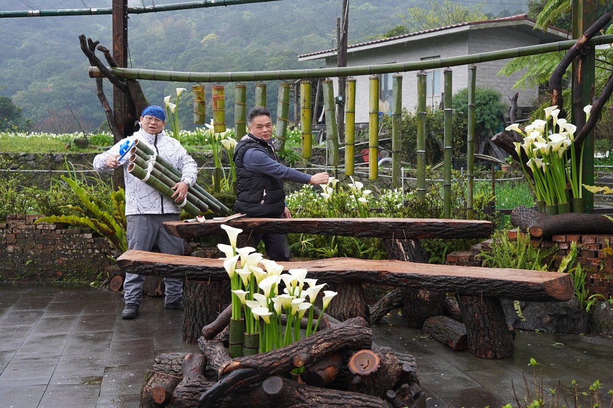 圖說:北投區農會魏俊凱(左)、發現生活園藝農友曹昌正(右),邀遊客走入花田、敲響竹管。