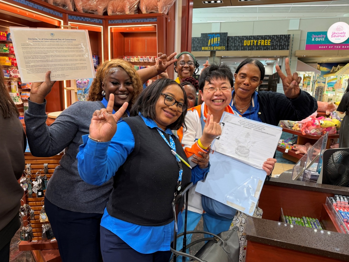 圖二:在巴哈馬機場,曾雅琪(右二)見證販賣部員工們熱情響應愛、和平與希望的連署,每一份參與,都是讓世界更美好的動力。