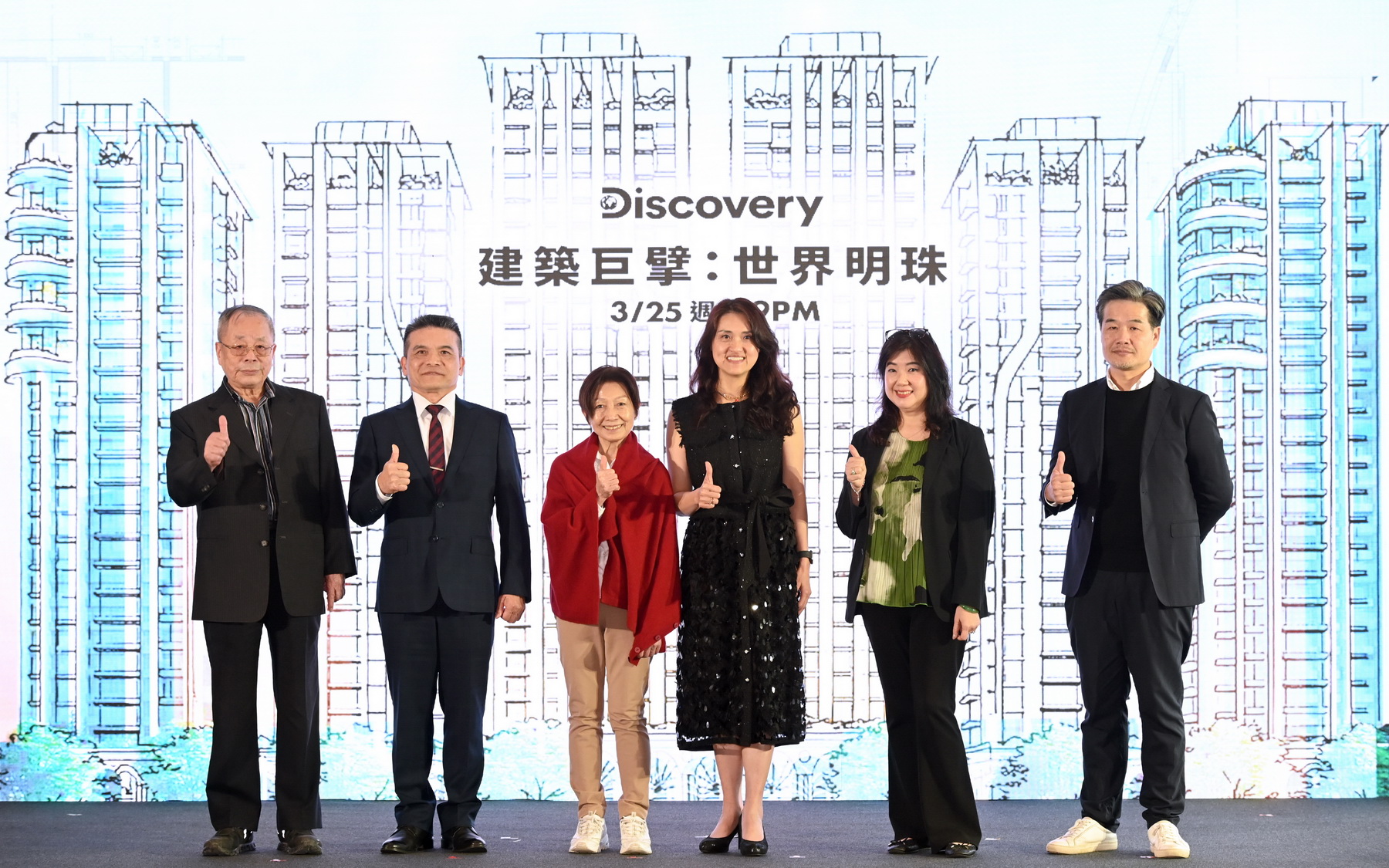 【Discovery《建築巨擘:世界明珠》】六位嘉賓一同進行首映啟動儀式。(由左至右)南榮開發建築執行長洪國雄、南港輪胎董事長郭林諒、南港輪胎榮譽董事長林夫人、華納兄弟探索集團大中華區廣告業務及內容發行長馬艷華、華納兄弟探索集團亞太區內容總監李美儀、導演楊守義。