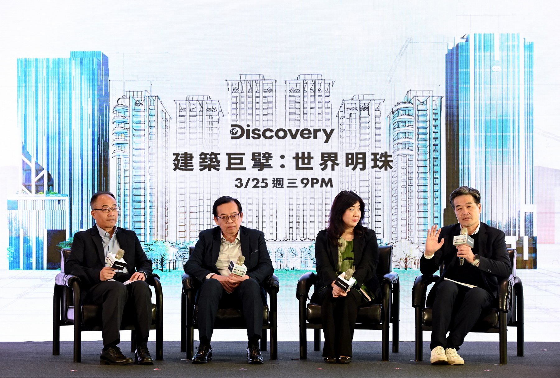 【Discovery《建築巨擘:世界明珠》】分享《建築巨擘:世界明珠》 拍攝歷程與建築背後的工程故事。(由右至左)節目導演楊守義、華納兄弟探索集團亞太區內容總監李美儀、南榮開發建築工務部協理曹樹文、中鹿華熊J工務所所長蔡文忠。
