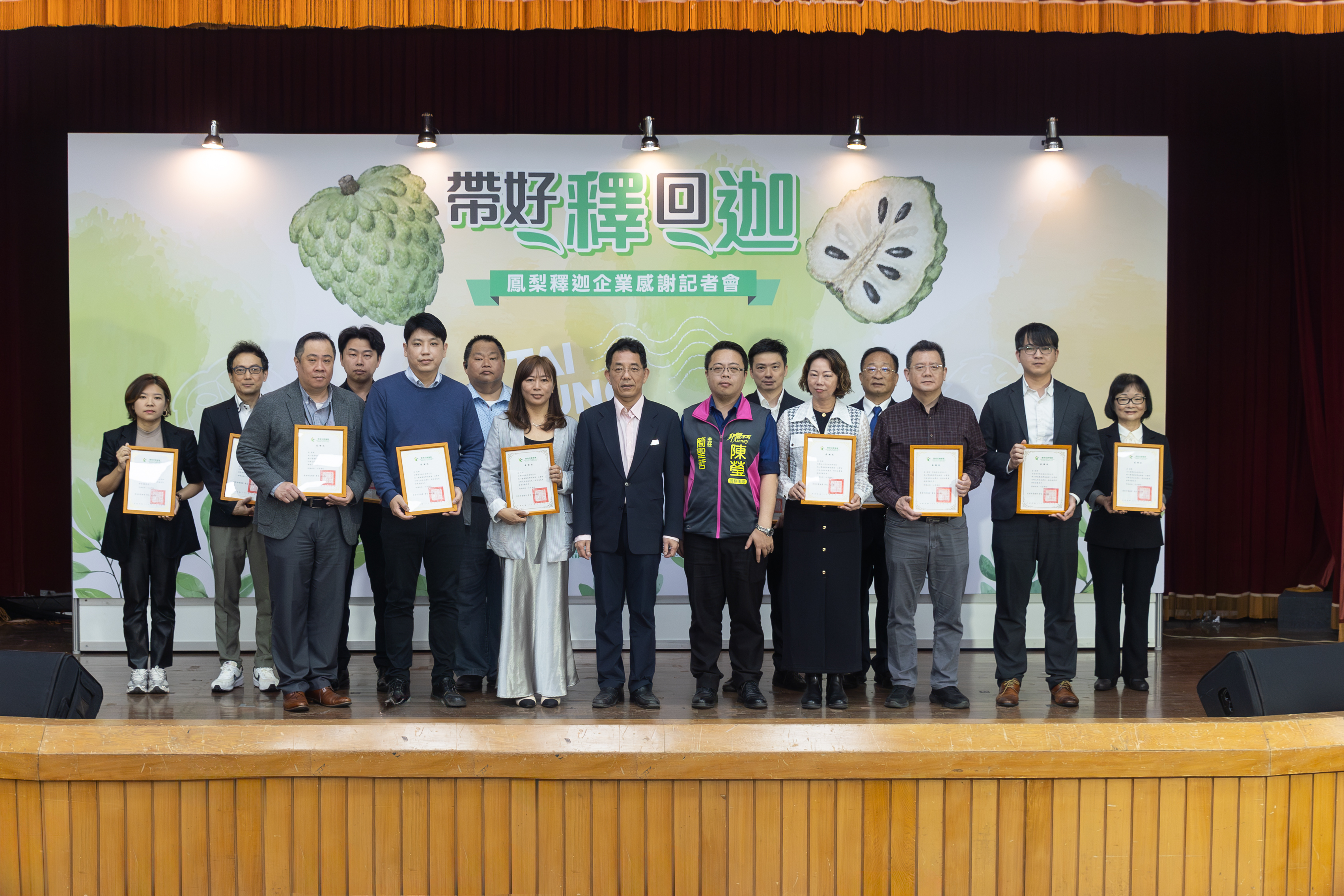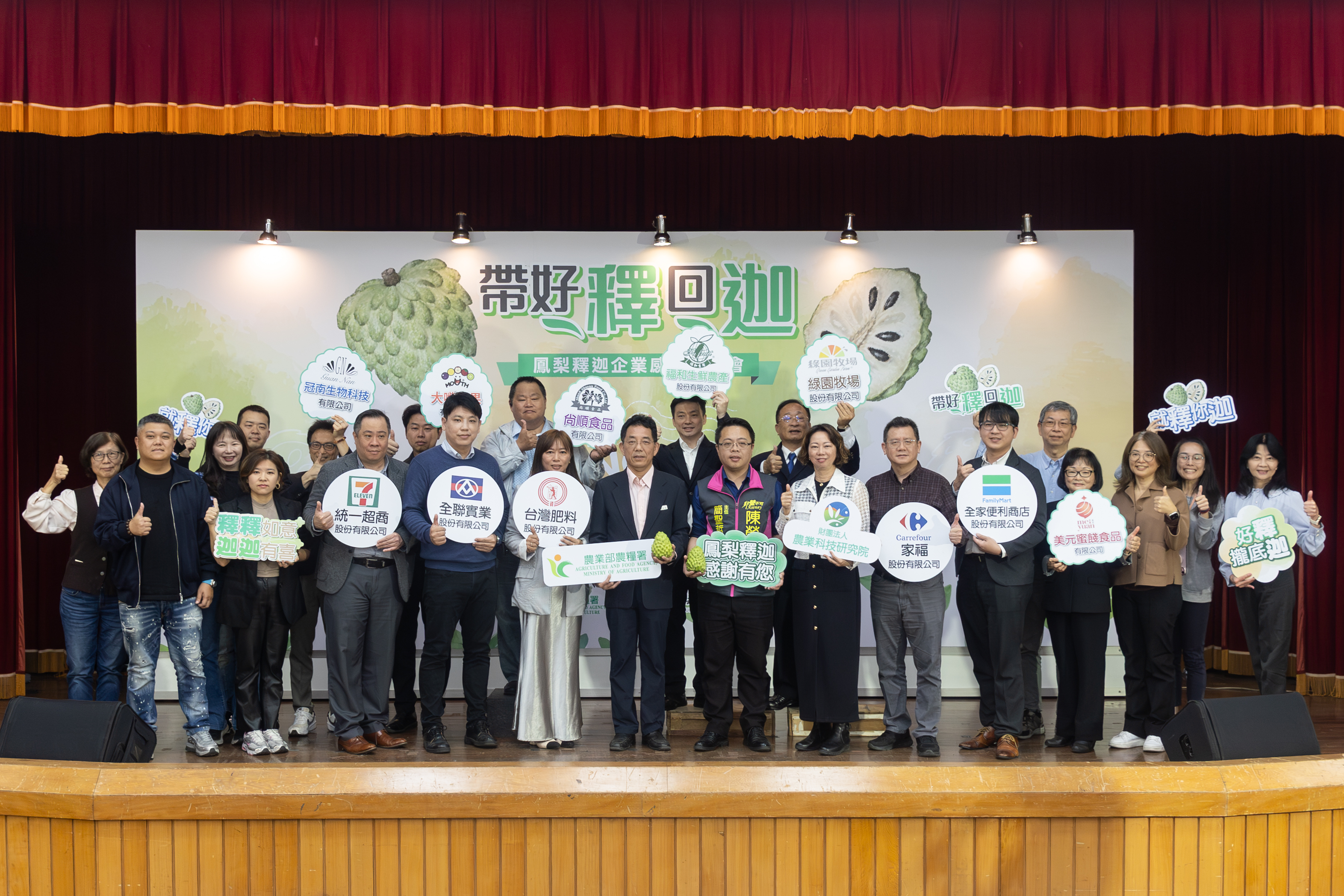 為表揚企業攜手推廣鳳梨釋迦並展現產銷合作成果,農業部農糧署3月18日舉辦「帶好釋回迦—鳳梨釋迦企業感謝記者會」,邀集企業、通路、加工業者及產地農民團體共同參與,活動特別表揚本(114/115)年期積極推廣鳳梨釋迦的企業,包括台灣肥料股份有限公司、全聯實業股份有限公司、家福股份有限公司、統一超商股份有限公司、全家便利商店股份有限公司及尚順食品有限公司。透過企業採購、通路販售及加工加值等合作模式,不僅拓展鳳梨釋迦銷售管道,也讓更多消費者一同支持國產水果,展現政府、企業與產業齊力穩定農產品產銷的成果。