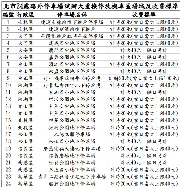 圖說:北市試辦大重機共用機車格,交通局1圖秒懂24處收費標準。(北市交通局提供)