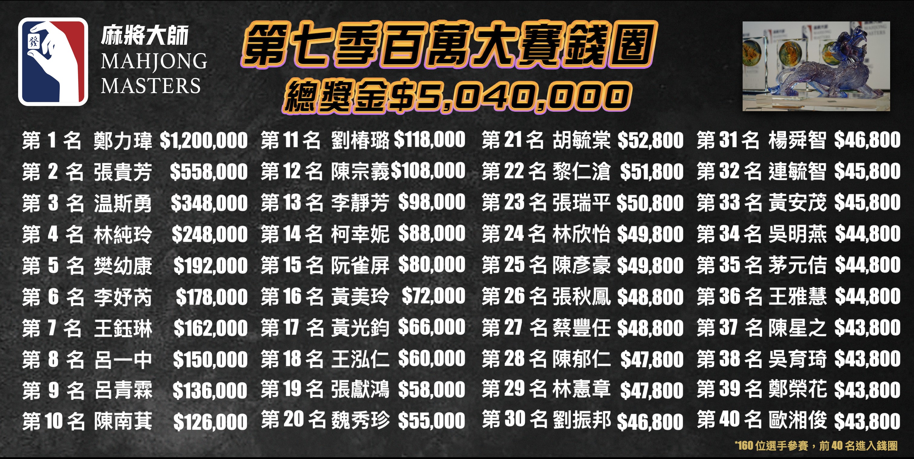 【台北訊】《麻將大師》第七季百萬大賽主賽事圓滿落幕,本季賽事創下參賽人數與總獎金雙新高,共吸引全台超過6,000人參與,最終由160位選手晉級主賽事,爭奪總獎金504萬元與最高榮譽「麻將大師」頭銜。經過多輪激烈淘汰賽後,來自台北、年僅21歲的大學生鄭力瑋,在最終4人決賽中脫穎而出,成功奪下冠軍,抱回新台幣120萬元獎金及象徵最高榮耀的「貔貅紫琉璃冠軍獎盃」,寫下以千元報名費翻轉人生的勵志故事。