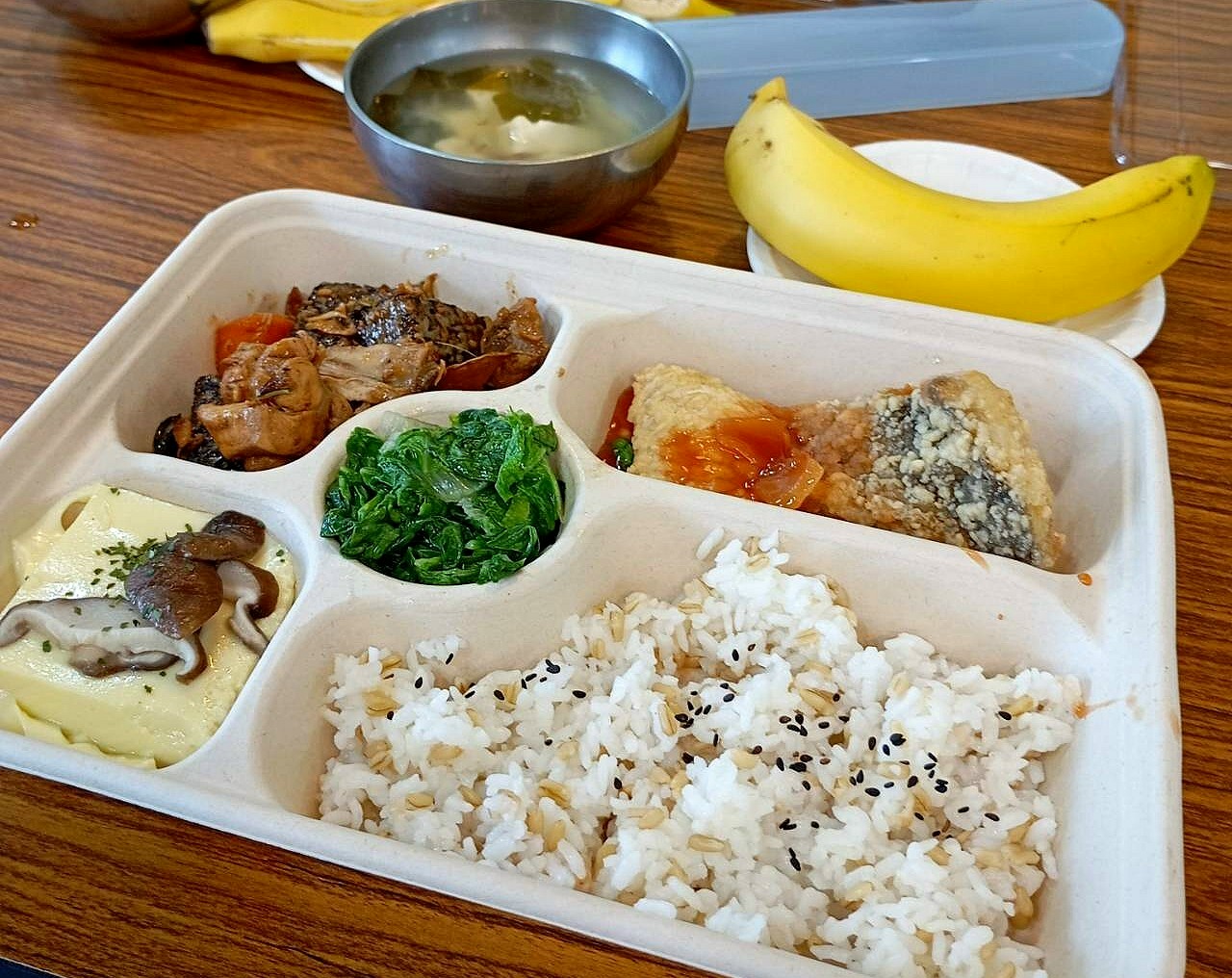 值得一提的是,每周「精選餐」(如圖所示)獨家曝光,主食包括燕麥白米飯,菜色(逆時針)包括糖醋金目鱸魚、三杯雞、有機荷葉白菜、有機菇蒸蛋,以及海帶味噌豆腐湯、香蕉1根,9月後將會出現在校園,記者試吃評價為餐廳等級美食。【台灣新生報】