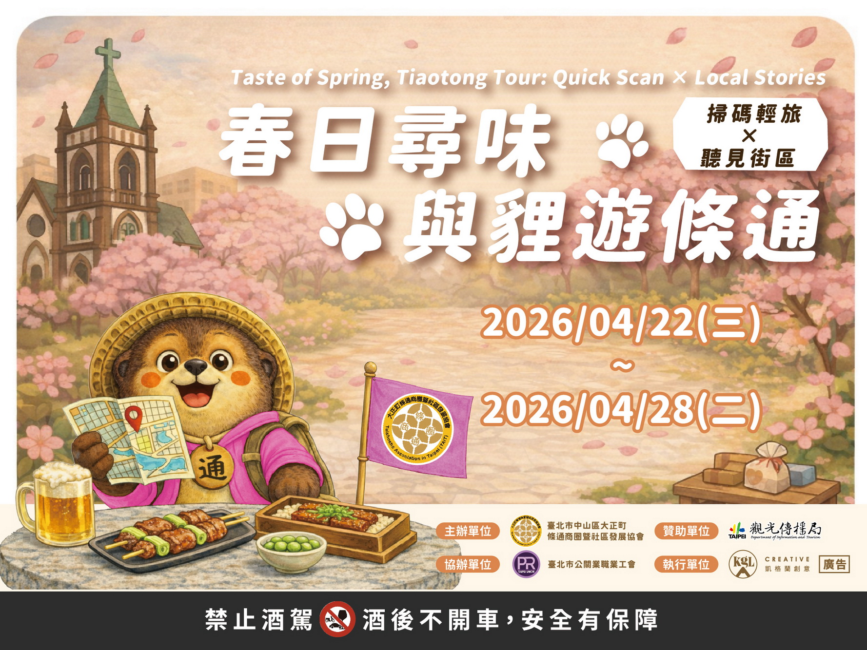 【記者林子霞台北報導】為推廣條通商圈文化魅力,臺北市中山區大正町條通商圈暨社區發展協會獲臺北市政府觀光傳播局補助辦理「春日尋味・與狸遊條通:掃碼輕旅 × 聽見街區」活動,結合狸貓IP「通通」、街區走讀、數位導覽與店家串聯,打造一系列結合文化導覽與數位體驗的春日遊條通行程,帶領民眾展開一場深入巷弄的條通街區小旅行。活動同步推出「掃碼輕旅」數位體驗,民眾只需掃描QR Code,即可透過LINE@選擇路線,搭配YouTube雙語語音導覽隨走隨聽,輕鬆展開條通小旅行。