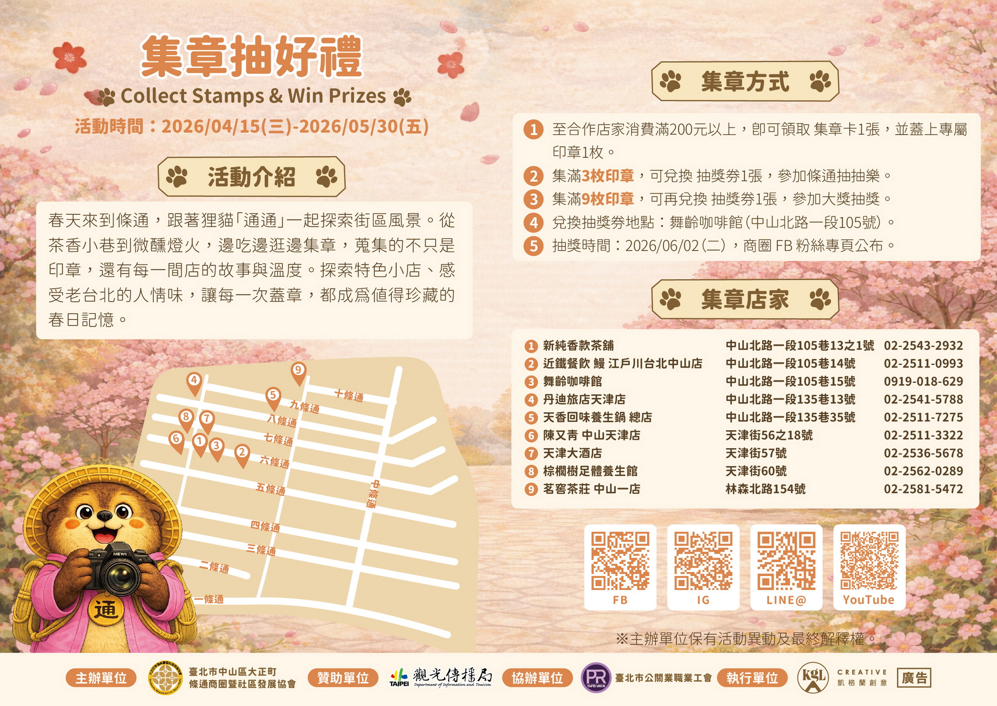 除走讀活動外,民眾於4月15日至5月30日期間,至合作店家單筆消費滿200元,可領取「條通集章春日遊」集章卡,參與本次春日遊條通任務。完成指定條件後,即可參加抽獎活動,獎項包含3C家電、店家優惠及特色商品等,進一步帶動中山區美食消費與商圈人潮。