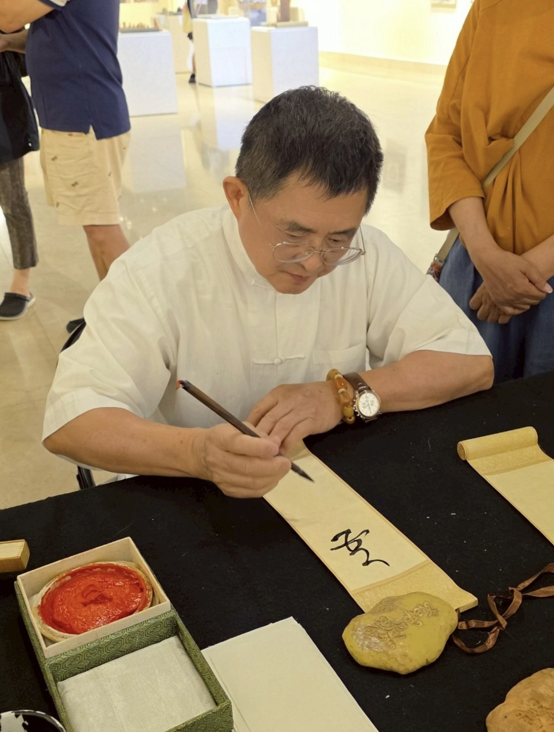李天任致詞表示,華梵大學注重品格與修行,同學在吳大仁老師帶領下,在「禪茶兩忘」的境界中,充滿喜悅的學習書法與篆刻,機緣難得,尤其篆刻只需要一把刀在手,隨時隨地都能坐下來完成作品,其中富含深厚的中華文化底蘊與美麗的書法型態,是值得推廣的藝術。