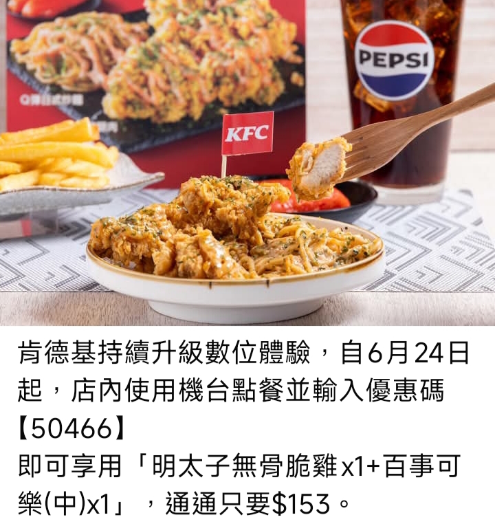 自助點餐機新功能解鎖,打造更完善會員新體驗為提供消費者更便捷、聰明的用餐體驗,肯德基持續優化數位服務,自6月24日起店內自助點餐機再升級!凡於機台點餐時輸入優惠碼【50466】,便可以$153優惠價享用「明太子無骨脆雞x1+百事可樂(中)x1」,相當於單點炸雞加價$4即獲得中杯可樂乙杯!結帳時輸入手機號碼即可累積會員點數,下載並開通PK雙饗卡 APP還可享點數換美食、專屬優惠、跨店取餐團購服務,甚至參加天天遊戲活動,憑券掃描 PK 雙饗卡 App QR code 即可直接享優惠!
