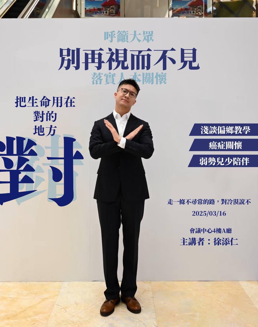 他指出,仍有許多偏鄉學童無法安心學習,癌症病患家庭也面臨經濟與心理的雙重壓力,更有許多孩子在家庭失功能的狀況下掙扎。他直言:「這些痛苦,從來沒有離我們多遠,只是我們選擇不去看、不去聽。」