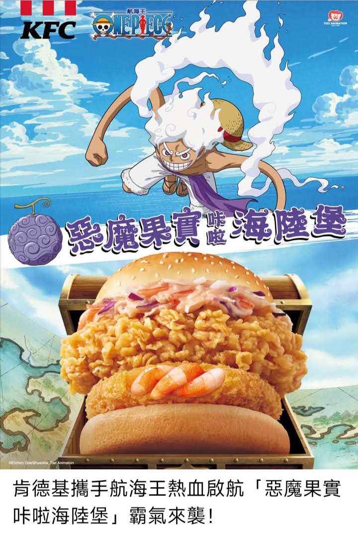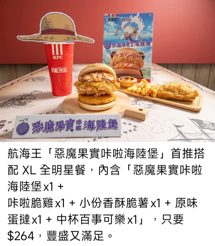 今年最熱血的冒險旗幟再度高掛,來自偉大航道的神祕力量,現蹤肯德基!肯德基驚喜宣布聯手風靡全球的超人氣動漫《航海王 ONE PIECE》,推出全新「惡魔果實咔啦海陸堡」,將經典咔啦雞腿排結合Q彈飽滿的金黃蝦排和特製蟹味醬,把「惡魔果實」的超能力化作真實滋味,一口解鎖「海陸雙重超能力」,惡魔果實原來就在肯德基!《航海王》粉絲們無須再羨慕草帽一行人了,動漫世界裡最稀有的「惡魔果實」力量,現在你也能擁有!9月9日起,加入肯德基的航海行列,咬下屬於你的惡魔果實,把征服大海的力量握在手中!「惡魔果實咔啦海陸堡」單點只要 $149,搭配限定版聯名寶箱漢堡盒,開盒就像尋寶——海陸美味驚喜現身!一口咬下,海陸雙重風味瞬間爆發,帶來如同獲得超能力般的味覺衝擊。想吃得更過癮,可升級為網友激推的 XL 全明星餐,僅 $264 就能一次享受「惡魔果實咔啦海陸堡」與多款豐盛點心,滿足感全面拉滿! 9 月 9 日起,跟著肯德基啟航,一同踏上屬於你的偉大航道,解鎖你的超能力!