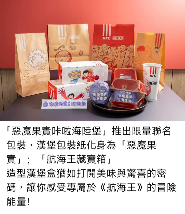 這次肯德基不僅和《航海王》攜手推出全新餐點「惡魔果實咔啦海陸堡」,為完美重現《航海王》的熱血冒險精神,「惡魔果實咔啦海陸堡」將以限量聯名包裝推出,眾多經典動漫角色躍然於包裝上,收藏控和動漫迷千萬不要錯過!這次聯名系列,漢堡包裝紙化身為「惡魔果實」,握在手中就像獲得力量;「航海王藏寶箱」造型漢堡盒猶如打開美味與驚喜的密碼,帶你解鎖專屬航海寶藏。牛皮紙袋印有魯夫、喬巴、娜美等人氣主角身著未來島蛋頭篇服飾的帥氣模樣,讓角色從二次元走入現實,陪伴你的美食旅程。喜歡一次大嗑的粉絲不能錯過 XL 全明星餐,餐盒上特別印製魯夫與喬巴,霸氣與萌力同框;冷飲杯則以「惡魔果實」為設計核心,手握冰涼飲品同時,感受專屬於《航海王》的冒險能量。9 月 9 日起,入店消費即可獲得《航海王》全系列限定聯名包裝,帶著夥伴們的信念一起啟航,收藏專屬回憶、再掀熱血風暴!數量有限,航海迷們快來肯德基尋寶,開啟你的超能力覺醒之路!