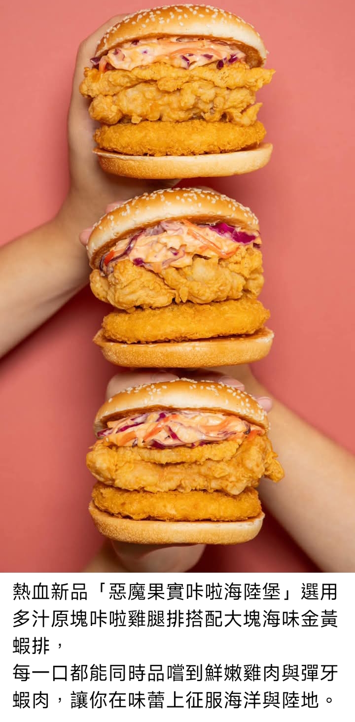 傳說中,吃下惡魔果實者將獲得神秘力量,如今惡魔果實就在肯德基!這股力量被完美化為全新餐點——「惡魔果實咔啦海陸堡」,一次滿足海與陸的雙重美味霸氣登場!熱血新品「惡魔果實咔啦海陸堡」選用多汁原塊咔啦雞腿排搭配大塊海味金黃蝦排,每一口都能同時品嚐到鮮嫩雞肉與彈牙蝦肉,讓你在味蕾上征服海洋與陸地。漢堡更特別加入以東南亞熱帶海洋藍泳蟹蟳味絲、蝦高湯與芥末提味調製拌入香濃美乃滋,加上新鮮高麗菜絲融合成獨門蟹味醬,層層堆疊出濃郁又清爽的多重口感。咬下瞬間,猶如真正吃下惡魔果實,強大能量自舌尖湧入全身,喚醒體內沉睡的冒險基因,邀你踏上征服美味的熱血航程。多層次、超飽足的海陸風味,從第一口到最後一口都是無盡驚喜。肯德基「惡魔果實咔啦海陸堡」,將《航海王》海上冒險的熱血與感動化作味蕾的真實體驗,隨時開吃、隨時啟航,開啟屬於你的冒險篇章!