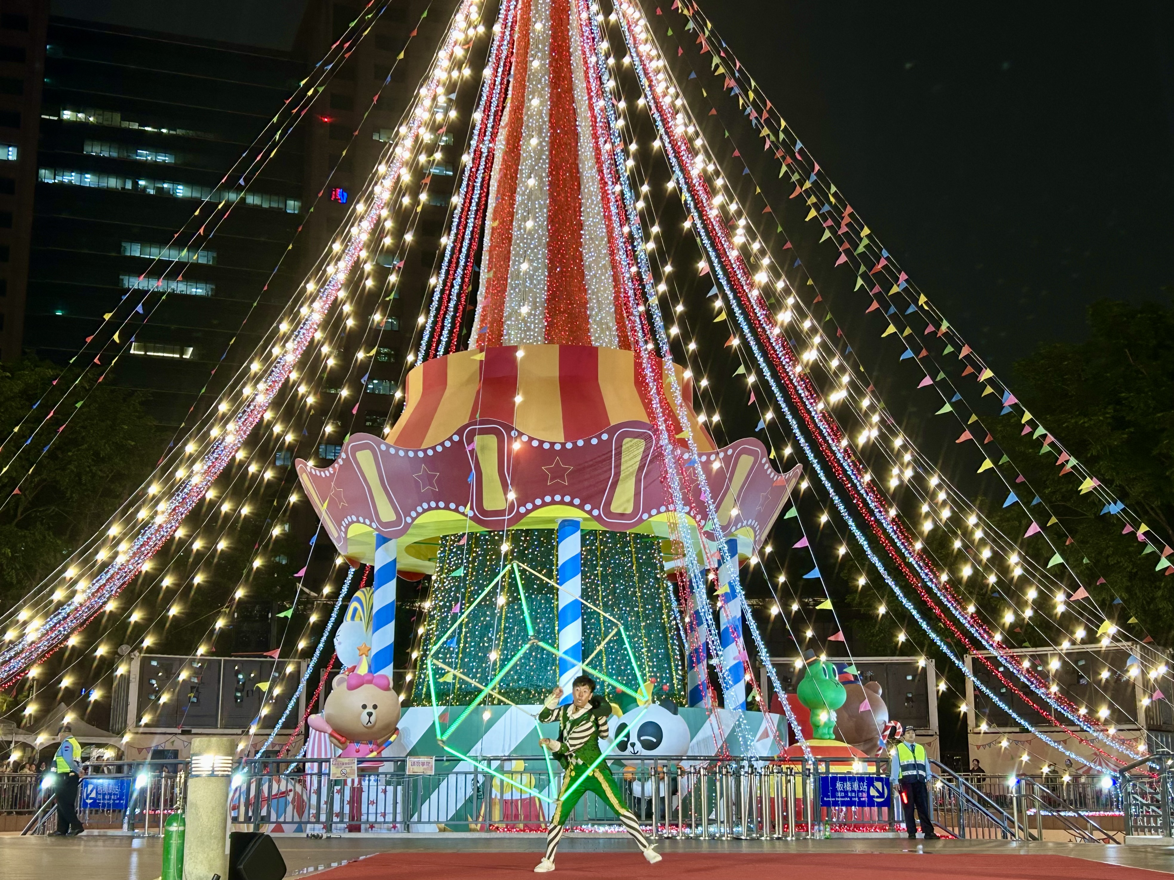 開城SHOW以華麗燈光搭配高難度馬戲特技震撼揭幕,空中絲綢、大型氣球造景交織出奇幻節慶氛圍。啦啦隊女神李雅英在 LINE FRIENDS 兔兔陪同下驚喜登場,與新北市長侯友宜同台互動,全場瞬間嗨到最高點。侯市長與貴賓隨後啟動點燈,象徵為期45天的耶誕慶典正式啟動。