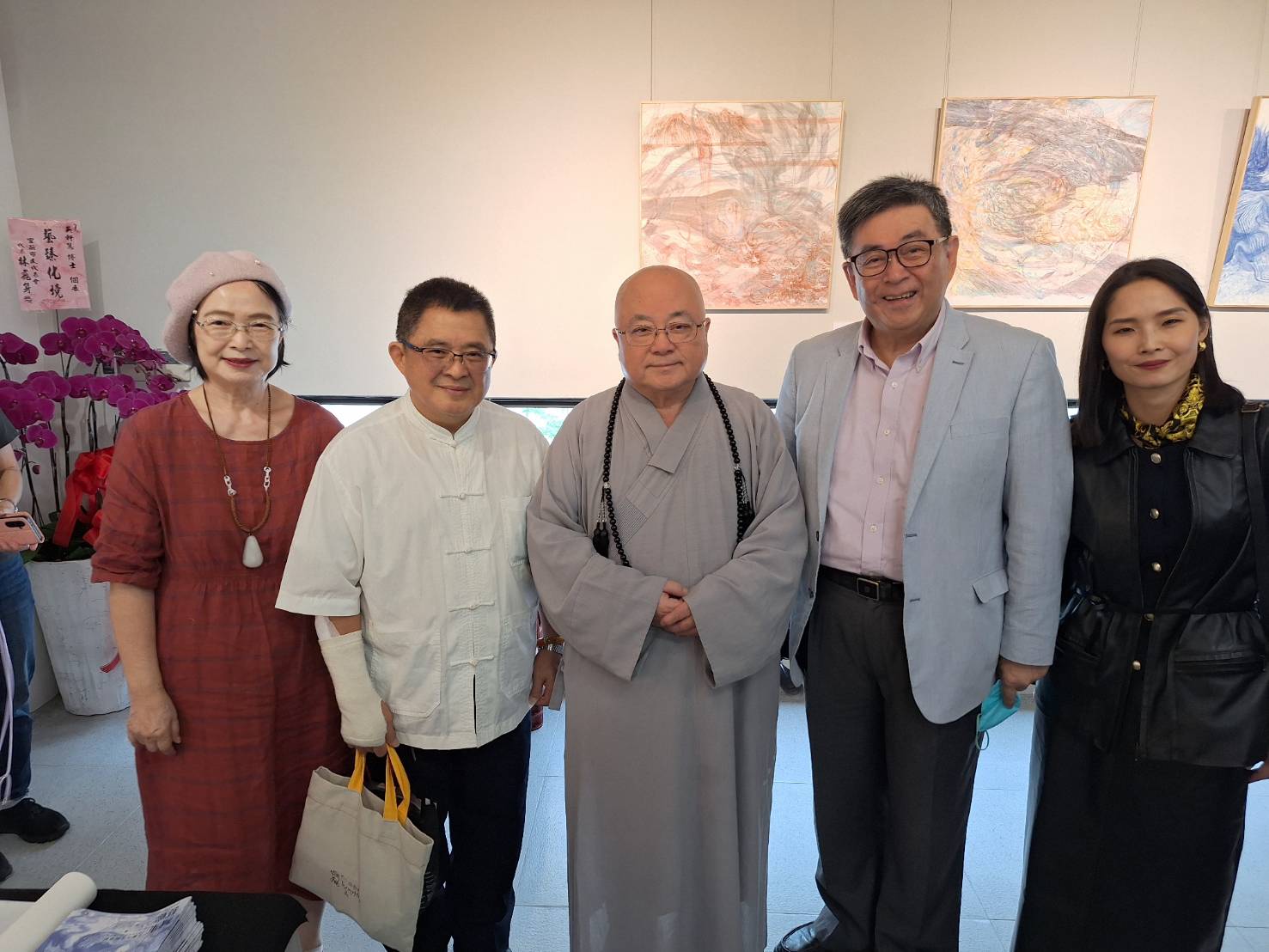 今日參加開幕茶會的僧俗,除了法鼓山退居方丈果東和尚、華梵大學校長李天任、吳大仁大師伉儷之外,尚有策展人林耀南、華梵大學教務長簡江儒、佛藝系主任陳俊吉、宜蘭區公所秘書何明憲、彰化縣政府衛生局秘書林慧姿、溪湖鎮公所秘書楊定欽、聖心診所所長黄寶凱、茶道教授吳秀真、吳千惠老師、攝影家陳英俊、準提精舍負責人吳登諺、江芷霖、精舍住持心慧法師、照果法師、宜蘭市民代表林飛身、宜蘭美術協會榮譽理事長鄒森均、藝術家游樹林、賴棟材,以及吳大仁大師的圓光禪寺敦親睦鄰書法班4位學生、華梵大學10位學生…等人。(圖/智海居士攝)
