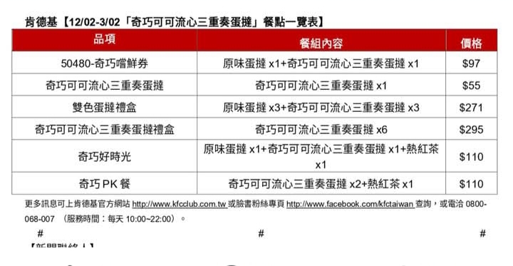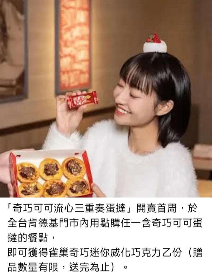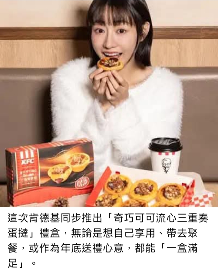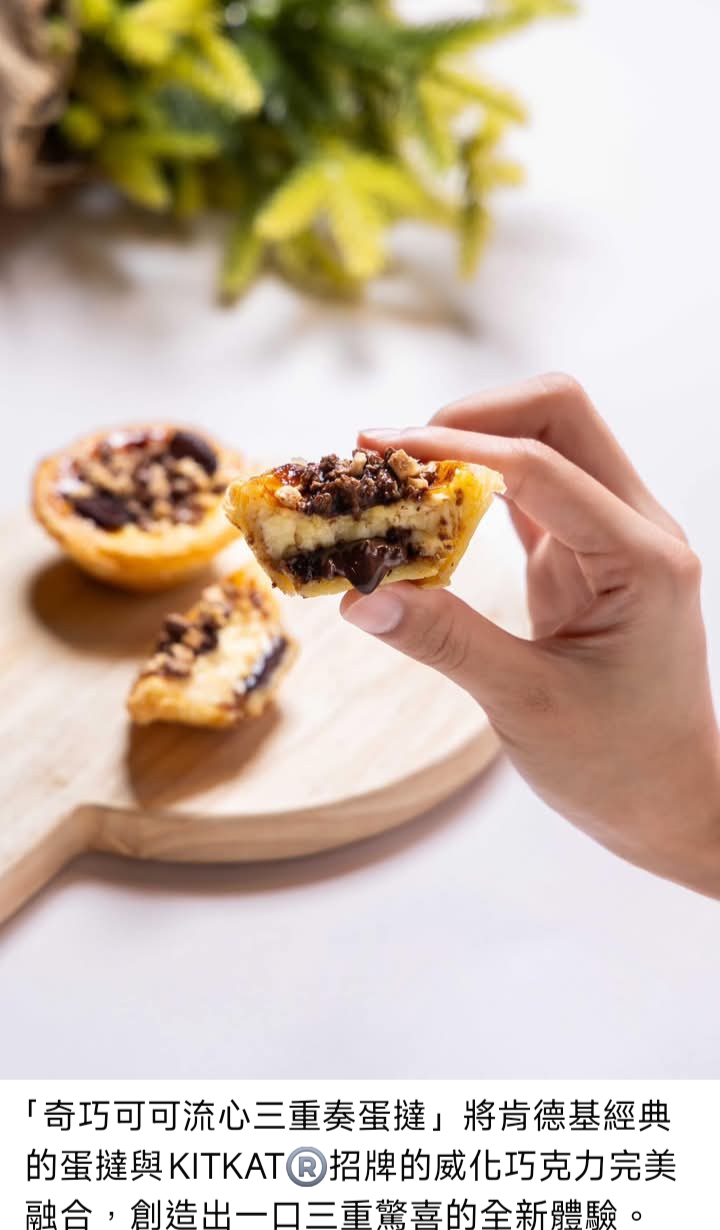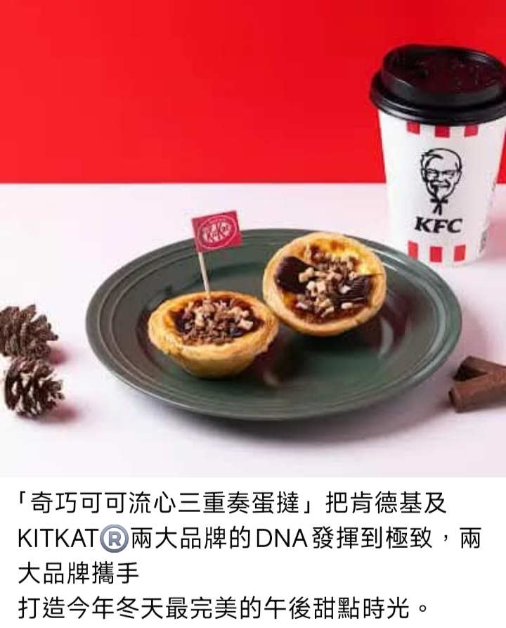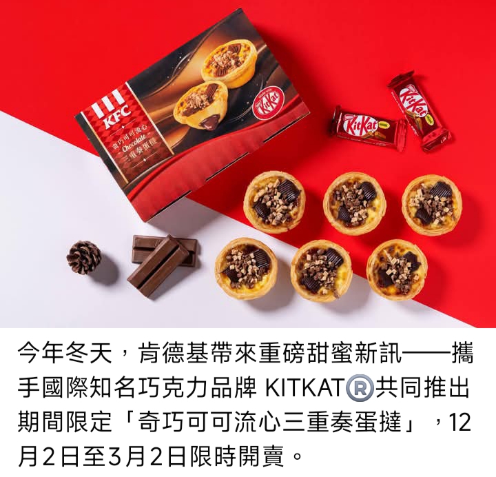 這次的合作不僅是一場味覺革命,更是一種屬於甜點愛好者們的情感共鳴。販售期間自12月2日至3月2日於全台肯德基門市限時供應;不只如此,肯德基還加碼送驚喜——「奇巧可可流心三重奏蛋撻」開賣首周於肯德基「內用」限量加贈KITKAT®巧克力,幸福感直接 double up,完美呼應這次合作:強強聯手、滿足感加乘。從寒冬開場到初春尾聲,這款甜點以一抹可可香陪伴每個團聚時刻,無論是家人歡聚、朋友聚餐,還是節慶交換禮物,都能成為最暖心的驚喜。