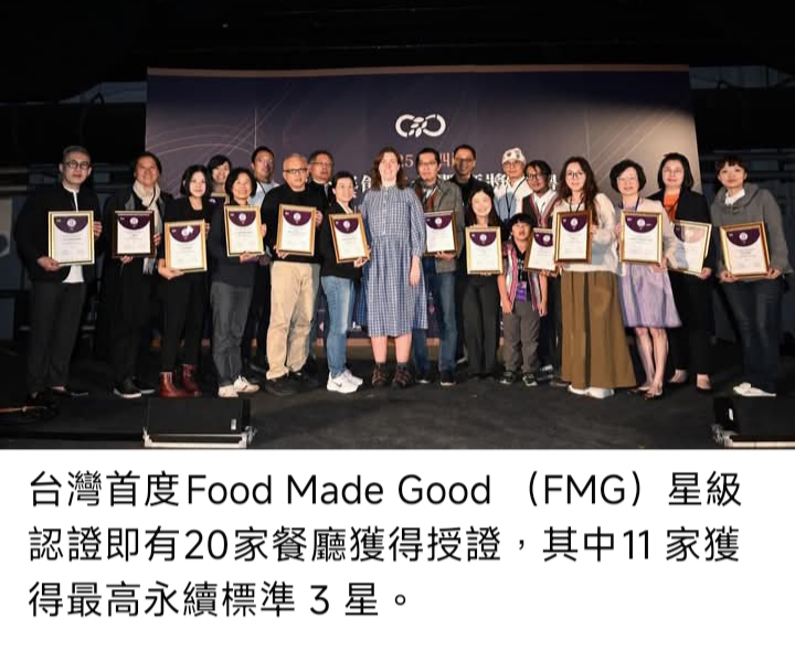 今年台灣綠色餐飲界更共同迎來一個重要的里程碑——台灣首度「Food Made Good(FMG)星級認證」星級餐廳授證儀式。台灣首屆參與即有 20 家餐廳獲得授證,其中更有 11 家獲得最高永續標準 3 星。透過源自英國、風靡全球的永續評鑑,更能看出台灣正式跨入與國際接軌的「永續餐飲星級時代」,綠色餐飲已成為當代餐飲經營的新哲學。