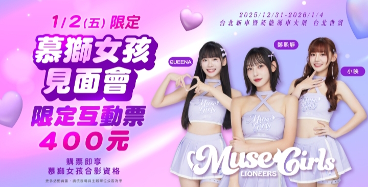 主辦單位將在1月2號特別邀請人氣啦啦隊Muse Girls(慕獅女孩)出席見面會現場,成員包括QUEENA、韓籍新成員鄭熙靜與在隊中相當受歡迎的小映。限量專屬互動票一開賣便秒殺完售。主辦單位表示,沒搶到票的粉絲也不必失望,現場仍能近距離見到三位人氣隊員,歡迎大家踴躍進場觀展,為心愛的偶像熱情應援。