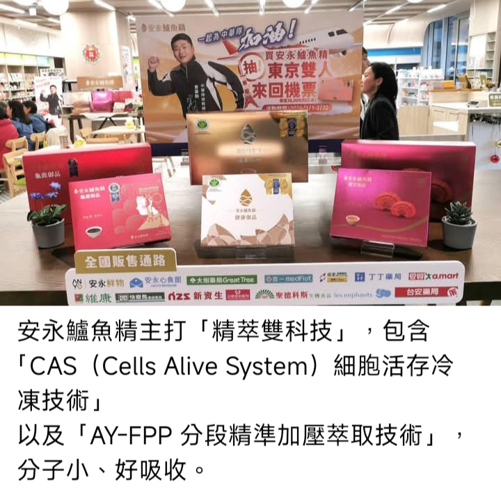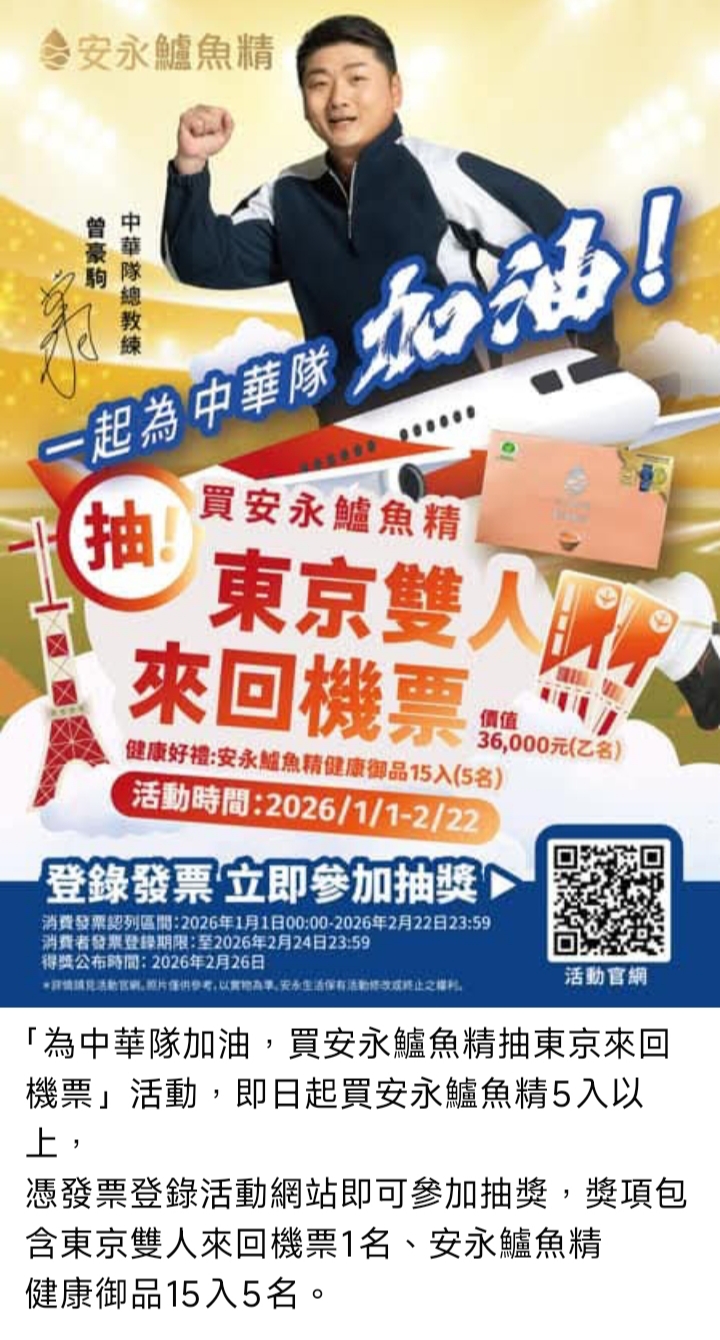 延續「補養集氣、為中華隊加油」的應援主張,安永生活也同步公布抽獎活動辦法。安永大健康事業執行長林進賢表示,「為中華隊加油,買安永鱸魚精抽東京來回機票活動」自 2026 年 1 月 1 日起至 2026 年 2 月 22 日止,凡於安永鮮物門市、安永鮮物官網、好市多、全國指定藥妝通路及各大購物網站購買安永鱸魚精系列指定商品(健康御品、靈芝御品、龜鹿御品,5 入以上品項),憑發票至活動網站完成登錄即可參加抽獎,獎項包含東京雙人來回機票(1 名),以及安永鱸魚精健康御品 15 入(5 名)。
