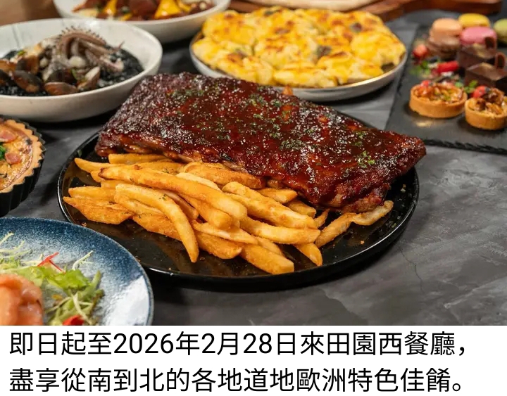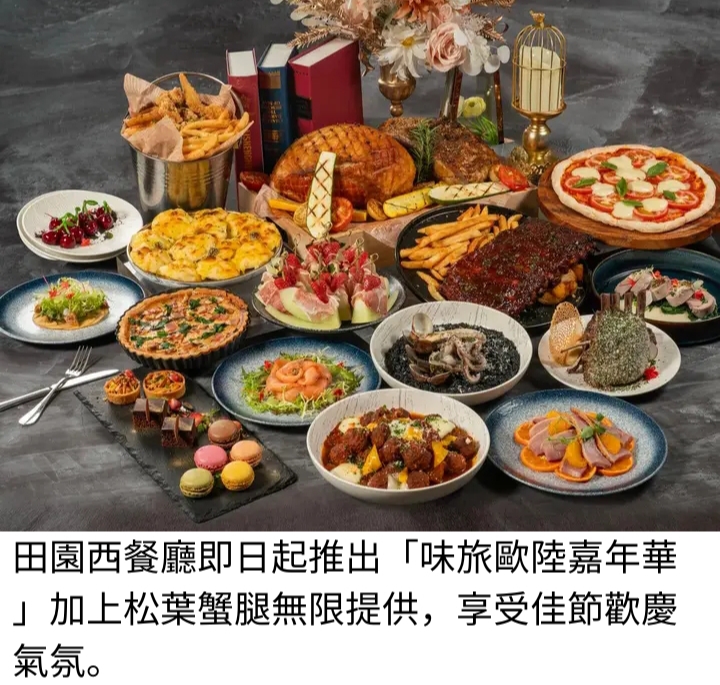 冬日總令人聯想到白雪皚皚的歐洲,福容桃園機捷A8店田園西餐廳,即日起至2026年2月28日,推出冬日限定主題「味旅歐陸嘉年華」,以歐洲經典料理為主軸,邀請民眾一站式巡禮、用味蕾玩遍歐洲,品嚐威尼斯墨魚燉飯、普羅旺斯香料烤雞、法式番茄燉羊膝與牛肉丸、BBQ烤豬肋排等道地傳統歐式佳餚外;前菜則以挪威燻鮭魚沙拉、蜜瓜火腿串、柳橙鴨胸沙拉與櫻桃鵝肝慕斯展現細膩層次。甜點區提供肉桂蘋果派、檸檬老奶奶、馬卡龍與樹幹蛋糕,搭配溫紅酒,以及無論平假日皆無限供應的松葉蟹腿,更讓人感受到佳節歡慶氣氛!!。