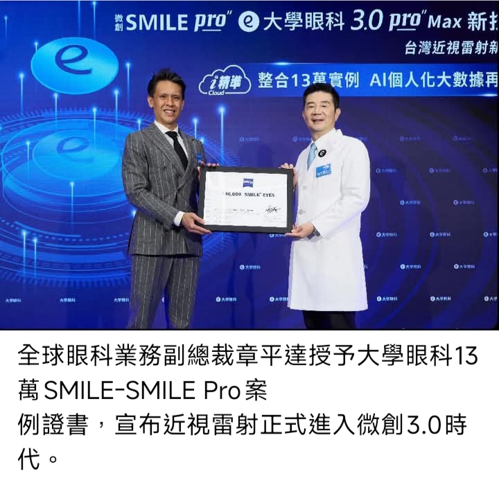 大學眼科榮譽總院長林丕容醫師表示:「當醫師對照相同術式、相同設備,不同條件的實際手術執行狀況與恢復表現,評估時不只是憑經驗,更有SMILE Pro 3.0 Max的核心雲端『i精準Cloud』AI大數據資料為依據,這對個人化雷射規劃是很實質的進步。」蔡司全球眼科業務副總裁章平達則表示,非常樂見在微創3.0 SMILE Pro平台上發展台灣實證參數,大學眼科進一步發展專屬的3.0 Pro Max數據庫,將AI導航再升級,精準客製化。龐大的術前、後臨床追蹤數據,正好補足了設備僅紀錄手術前和執行完當下的限制,當執行端與追蹤端的閉環資訊得以串聯,便能相互對照,形成更強大的數據庫,進一步提供台灣民眾最優質的個人化近視老花雷射的矯正選擇。