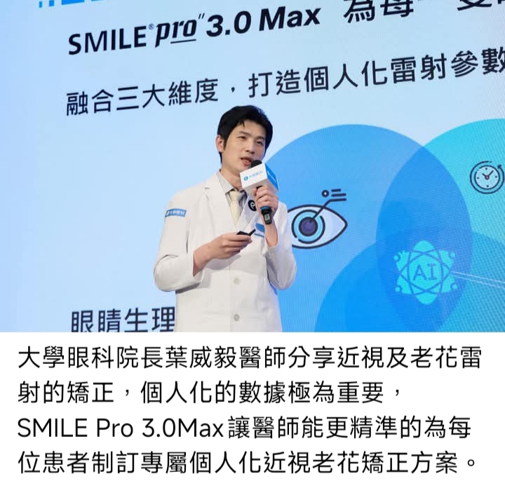 多數近視族群在考慮是否接受近視雷射時,除了矯正近視外,也會同時考量老花矯正或是日後面臨老花後的因應。大學眼科院長葉威毅醫師指出,臨床上合併近視與老花的中高齡族群比例明顯升高,詢問度成長約四成,與臺灣人口中位數「約46歲」的結構相呼應;這類型民眾在遠近視物切換(如開車看導航、外出看手機)及生活場景轉換中感受強烈不便,且常伴隨乾眼困擾,因此傾向尋求一次解決近視與老花困擾。葉威毅醫師說明,近視及老花的矯正,個人化的數據極為重要,新型SMILE Pro 3.0 Max應用「i精準Cloud」數據,根據每位患者的術前檢查資料、日常用眼習慣,以及模擬遠近交替試戴結果,結合大數據輔助優化相關參數,讓醫師能更精準的為每位患者制訂專屬個人化近視老花矯正方案。
