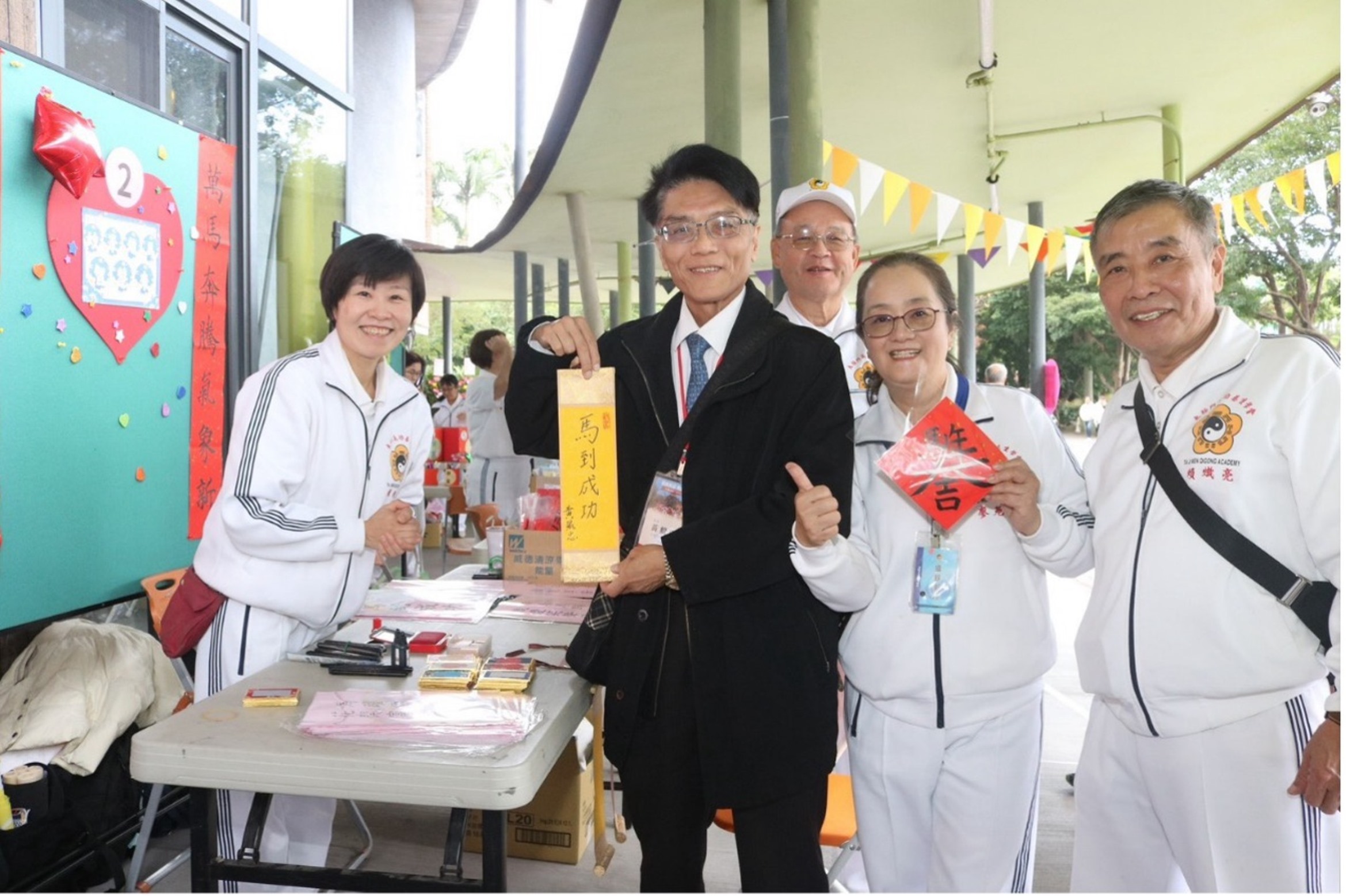 場外園遊會同步展開,以濃厚中華文化風格設計互動攤位,讓鄉親在遊戲中體驗太極門五寶——健康、財富、智慧、快樂與幸福。活動內容結合擊鼓傳遞祝福、書籤卷軸創作、趣味健身闖關、笑臉彩繪與驚喜福袋抽獎等多元體驗,現場氣氛熱絡,笑聲不斷。