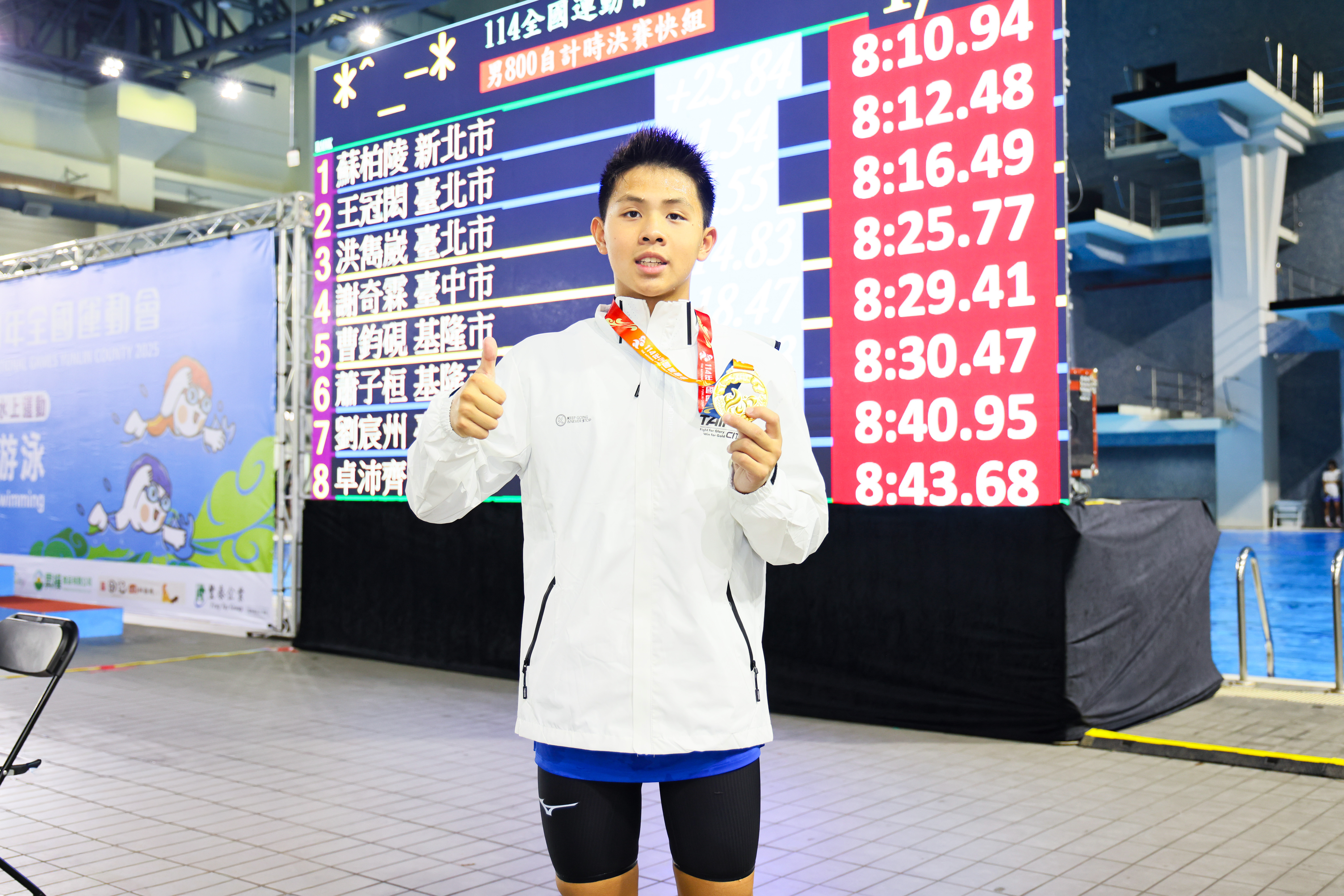 新北體育預算加碼至34億投入運動人才培育 圖為林口國中蘇柏陵在114年全國運800公尺自由式打敗王冠閎拿下全國運生涯首金 圖/新北市政府體育局提供