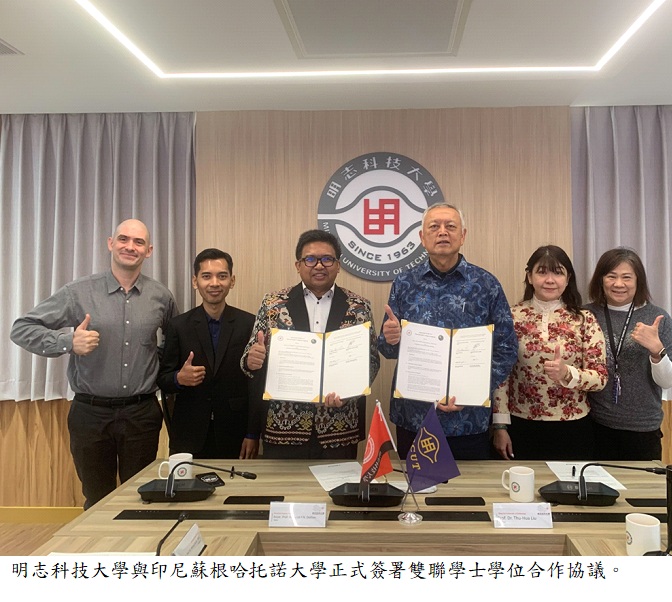 為深化國際學術合作並拓展學生跨國學習與就業競爭力,明志科技大學於去年年末接待姊妹校印尼蘇根哈托諾大學(Universitas Sugeng Hartono, USH)訪問團蒞校,雙方正式簽署「數位行銷設計2+2雙聯學士學位學程」合作協議,象徵兩校在國際人才培育上的合作邁入嶄新階段。