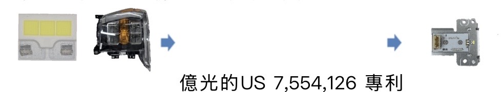 億光聲明,Lumileds的車用LED產品已使用億光美國覆晶專利US 7,554,126技術。該專利不僅可用於車用LED產品,更可涵蓋照明、燈絲、UVC、車用LED 、CSP、背光、閃光燈及Mini/Micro LED等多個領域。