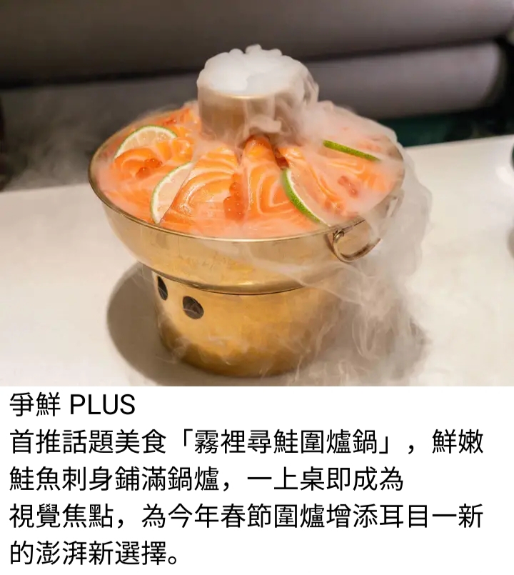 除了四大運勢壽司,爭鮮 PLUS 也推出話題十足的「霧裡尋鮭圍爐鍋」,頂部鋪滿鮮嫩的鮭魚刺身與晶瑩飽滿的鮭魚子,以首創生魚片「冷」火鍋概念,打造顛覆想像的春節圍爐創意吃法。