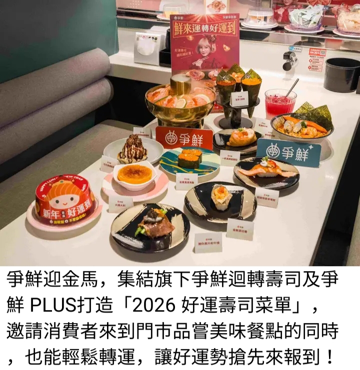 迎接馬年農曆春節,爭鮮搶先推出「2026 好運壽司菜單」,結合四大主題運勢,無論期盼升職加薪、感情升溫,或希望財富與健康同步到位,都能在爭鮮找到專屬的運勢補給壽司,大口享用美味的同時也能吃進好運!期間限定的開運盲盒將於爭鮮迴轉壽司及爭鮮 PLUS 限時販售,最大獎可開出馬年「金箔」豪禮,快來手刀試試今年的手氣!爭鮮更攜手命理專家–湯鎮瑋老師,獨家揭曉 2026 年十二生肖四大運勢排行,一次掌握各生肖的2026年運勢指南!