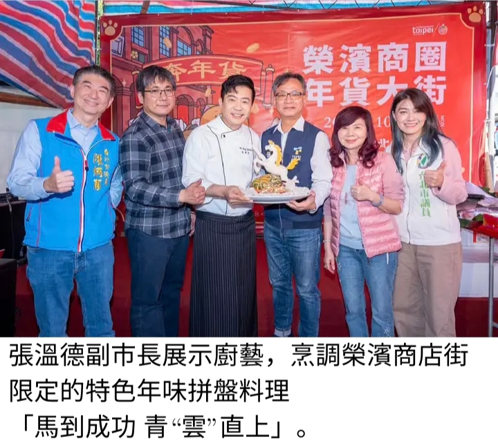 榮濱年貨大街於2月10日起至2月16日止熱鬧展開,今日張溫德副市長也親至現場向攤商與民眾拜年發放「馬上有錢 喵」,本次特別邀請型男大主廚–吳秉承與副市長共同結合濱江市場新鮮漁貨,推出限定特色料理「馬到成功–青“雲”直上」,藉此向民眾傳達來到榮濱商店街,可以免去四處採買的麻煩之餘,也可以自己在家DIY做年菜,讓大家輕鬆享受烹製年節佳餚的樂趣。