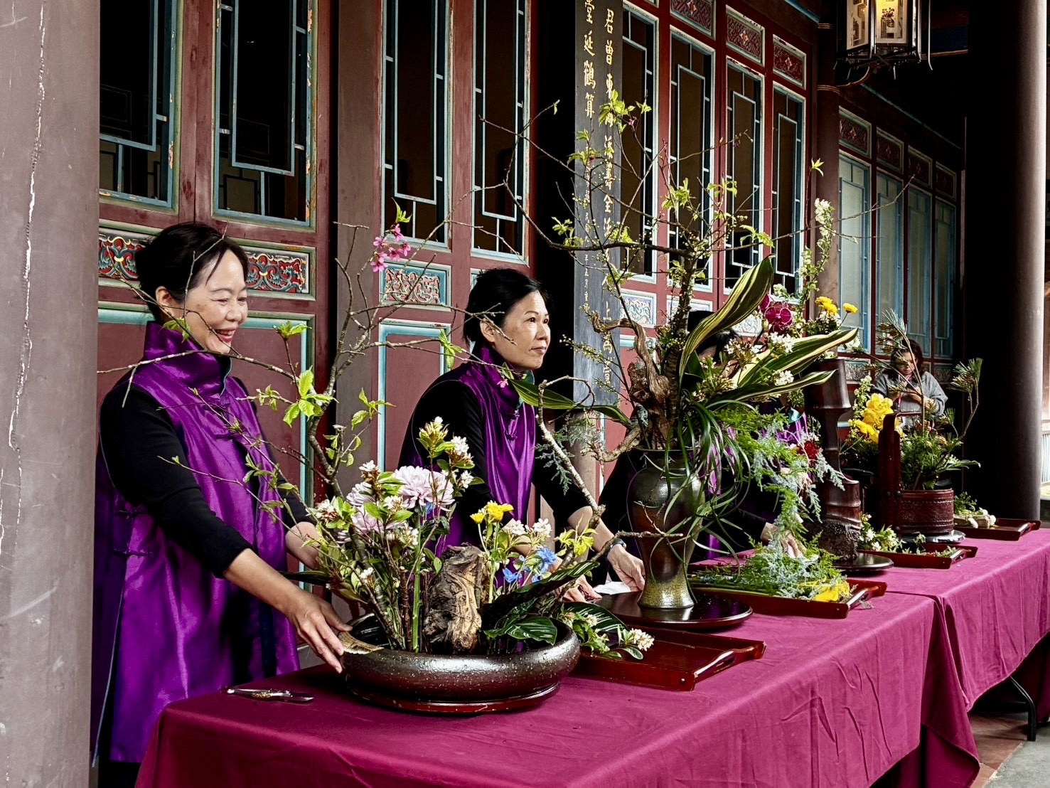系列活動亮點之一「芳華再現.花語林園」插花特展,與新北市中華花藝協會合辦,於今(28)日上午舉行開幕式,邀請協會專業師資進行插花示範,並結合品茶體驗,展現花藝美學與生活文化的細緻融合。新北市文化局表示「芳華再現.花語林園」精選花藝作品呼應園邸修復後的古樸風華,透過花與空間的對話,展現傳統花藝蘊含的祝福與文化深度。展覽自2月27日至3月8日止,採兩梯次展出(2月27日至3月3日、3月4日至3月8日),展期間部分作品將依梯次進行更換,讓民眾於不同時段造訪,皆能欣賞多元風格的花藝創作,感受花卉藝術於古蹟空間中的細膩變化,展現文化保存與古蹟活化的嶄新風貌。