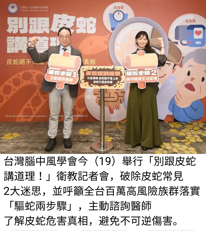 台灣腦中風學會今(19)舉行「別跟皮蛇講道理!」衛教記者會,破除常見皮蛇2大迷思,並呼籲全台心腦血管疾病病友3落實「驅蛇兩步驟」,主動諮詢醫師了解皮蛇危害真相,同時透過均衡飲食4、規律作息5等方式,讓皮蛇預防納入慢病管理的重要一環,避免不可逆傷害。