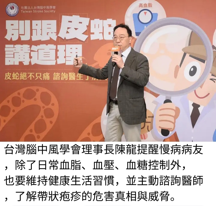 台灣腦中風學會理事長陳龍提醒高血壓、高血脂、糖尿病、慢性腎病、心腦血管疾病病友,除了日常血脂、血壓、血糖控制外,也要留意帶狀疱疹的威脅,透過落實驅蛇兩步驟,避免不可逆損傷!