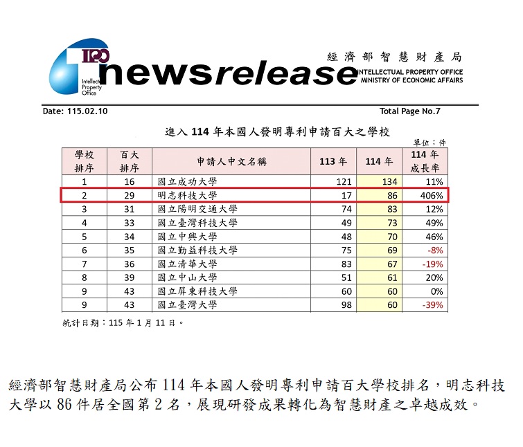 明志科技大學研發成果再創佳績。依據經濟部智慧財產局最新統計資料,114年本國人發明專利申請件數達86件,躍居全國大學第2名,展現學校將研究成果轉化為智慧財產的強勁實力與持續動能。