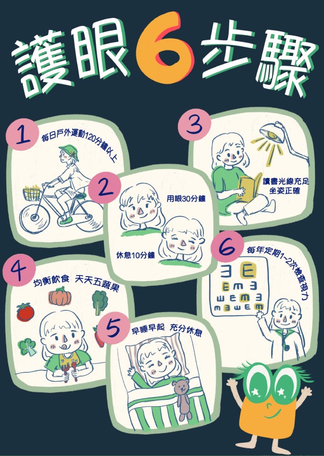 家長應留意孩子是否有瞇眼、歪頭看電視等異常行為,並自三歲起每年定期進行1至2次視力檢查。若發現異常,應立即就醫,遵從醫師建議。避免孩童近視,家長應協助建立正確用眼習慣: 2歲以下避免看螢幕、2歲以上每日不超過1小時、近距離用眼30分鐘要休息10分鐘、4每天至少120分鐘戶外活動、5早睡早起、均衡飲食並注意光線。