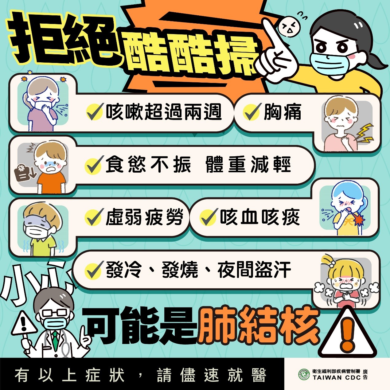 結核病是由結核桿菌感染所引起慢性傳染病,藉由咳嗽產生的飛沫傳染,在人多、不通風的空間特別容易傳染。