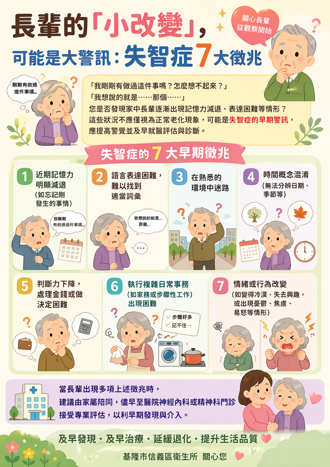 基隆市信義區衛生所提醒,預防失智症應從日常生活做起,包括:多動腦、多運動、積極參與社交活動,維持均衡飲食與適當體重,並妥善控制三高(高血壓、高血糖、高血脂)。同時,建立正確認知、及早接受治療,並善用家庭及社會資源,有助於提升患者與照顧者的生活品質。如有相關疑問,歡迎洽詢基隆市信義區衛生所(電話:2422-1633)。