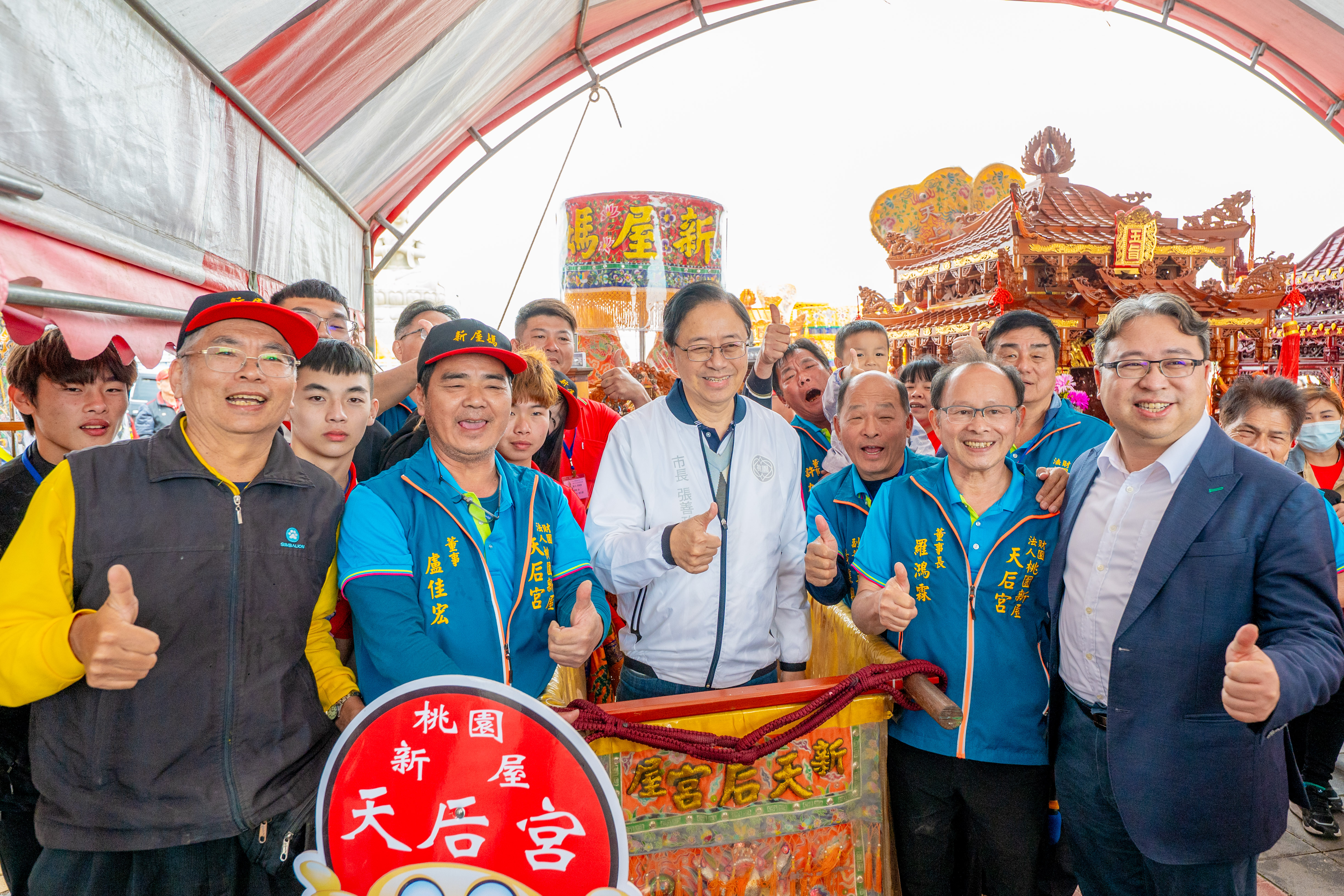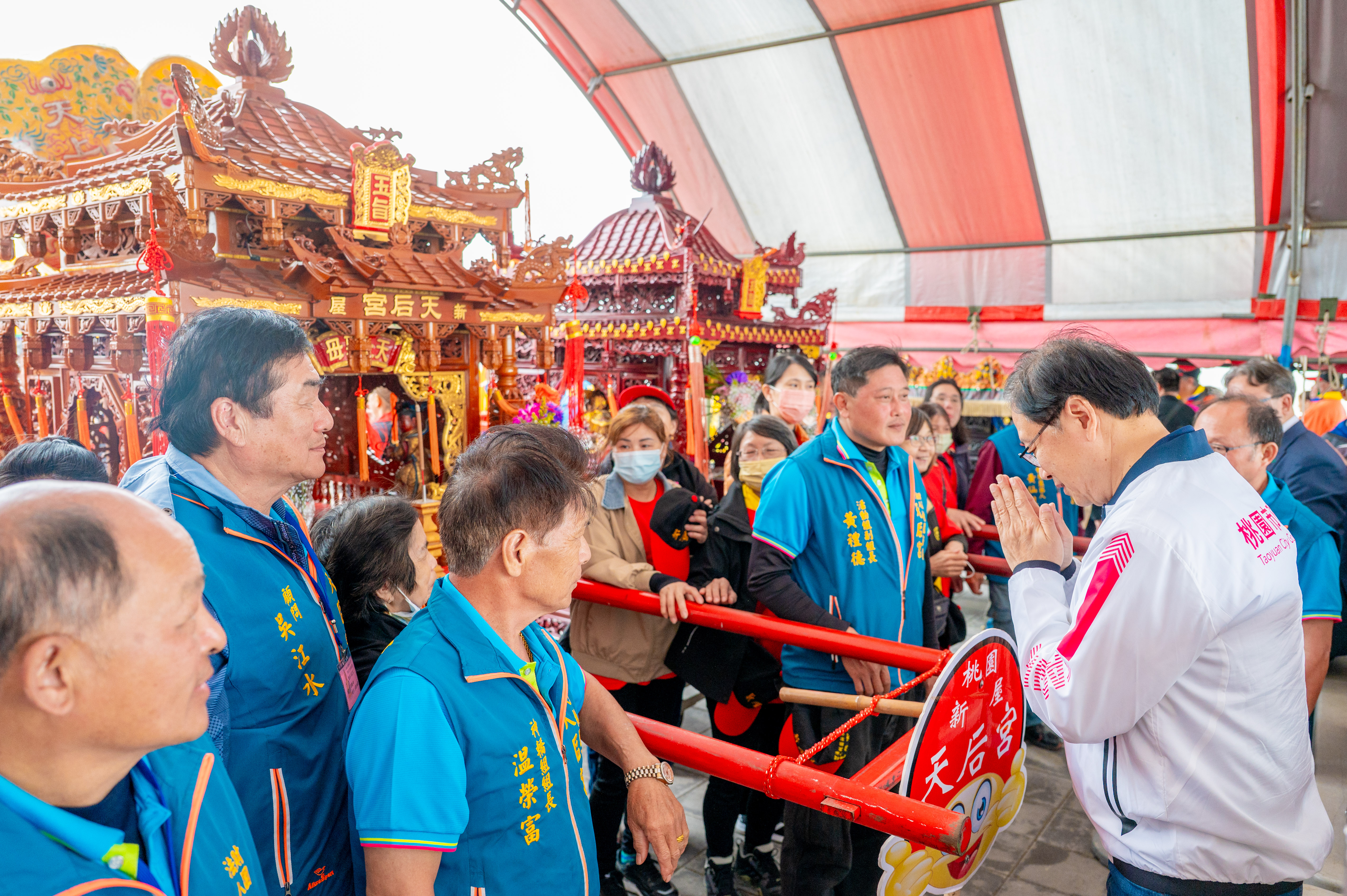 桃園市長張善政今(13)日下午前往新屋區,出席「新屋天后宮建廟200周年暨媽祖海上巡禮活動」。張市長表示,新屋天后宮是全臺唯一結合「海客文化」的信仰中心,永安漁港更是全臺唯一的客家漁港,其海上遶境結合陸地遶境,成為臺灣每年重要宗教慶典之一,感謝天后宮董事長羅鴻霖用心策劃活動,並祈求媽祖持續庇佑市民平安健康。