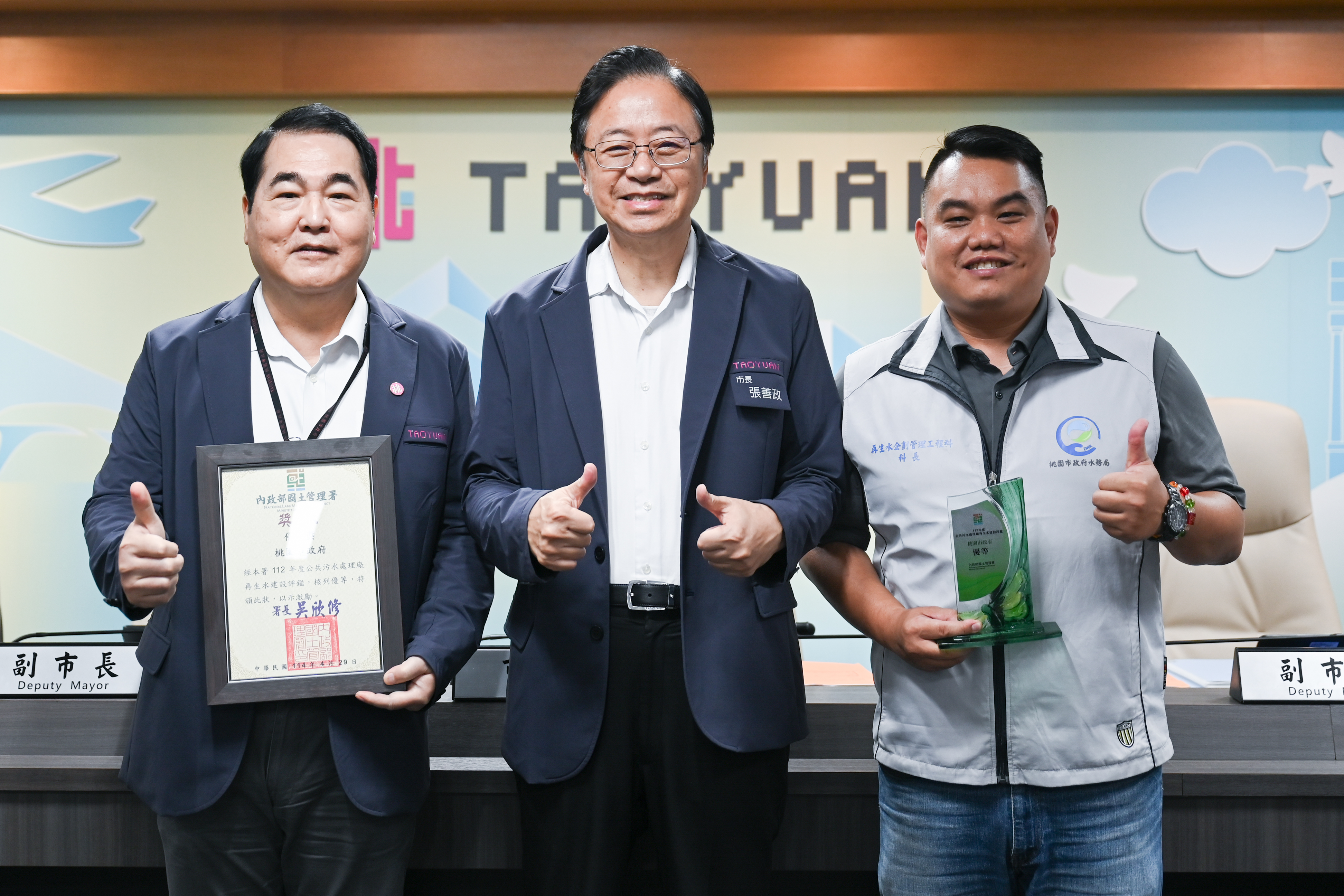 桃園市長張善政今(11)日上午主持市政會議,接受水務局呈獻榮獲內政部國土管理署「112年度公共污水處理廠再生水建設評鑑」優等獎。張市長表示,近年市府努力推動再生水、污水處理,並逐步改善本市溪流環境,感謝市府水務局同仁的努力,期勉團隊再接再厲持續優化本市水環境品質。