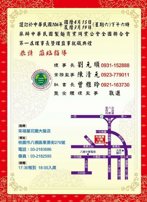 記者陳俊穎桃園報導今天十五日下午五點半,中華民國製麵商業同業公會全國聯合會第一屆理事長暨理監事假八德來福星大飯店舉行就職典禮,劉元順為創會理事長,全國製麵聯合會成立時,劉元順先生高票當選為創會理事長,今日重量級貴賓有鄭文燦市長、立委鄭寶清、立委趙正宇,人山人海,冠蓋雲集,場面溫馨熱鬧有人情味.