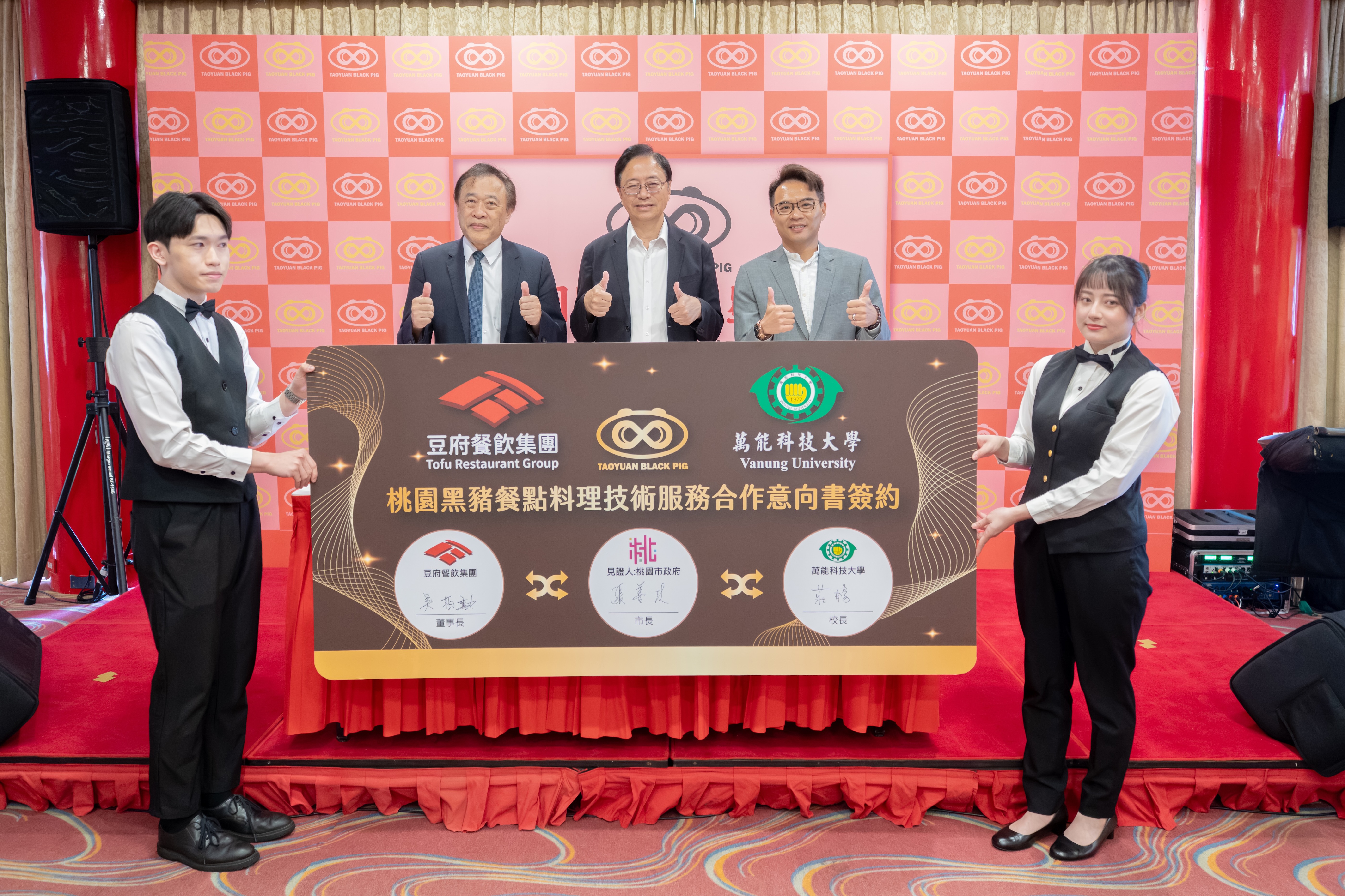 今日張市長與名廚對談後,亦現場見證豆府餐飲集團及萬能科技大學簽署「桃園黑豬餐點料理技術服務合作意向書」,共同推動產官學合作,拓展黑豬料理多元應用。