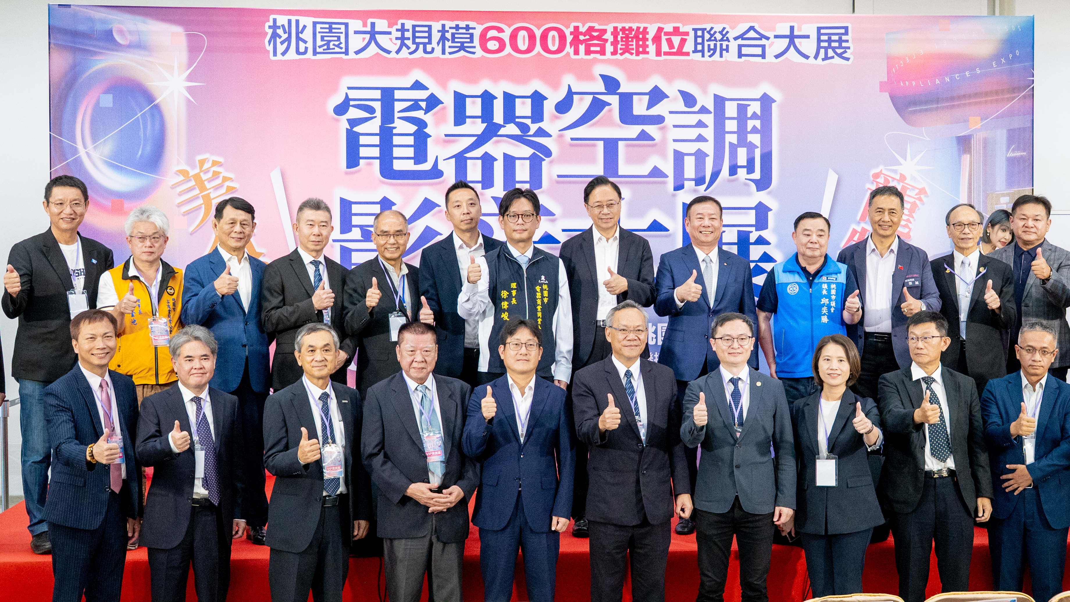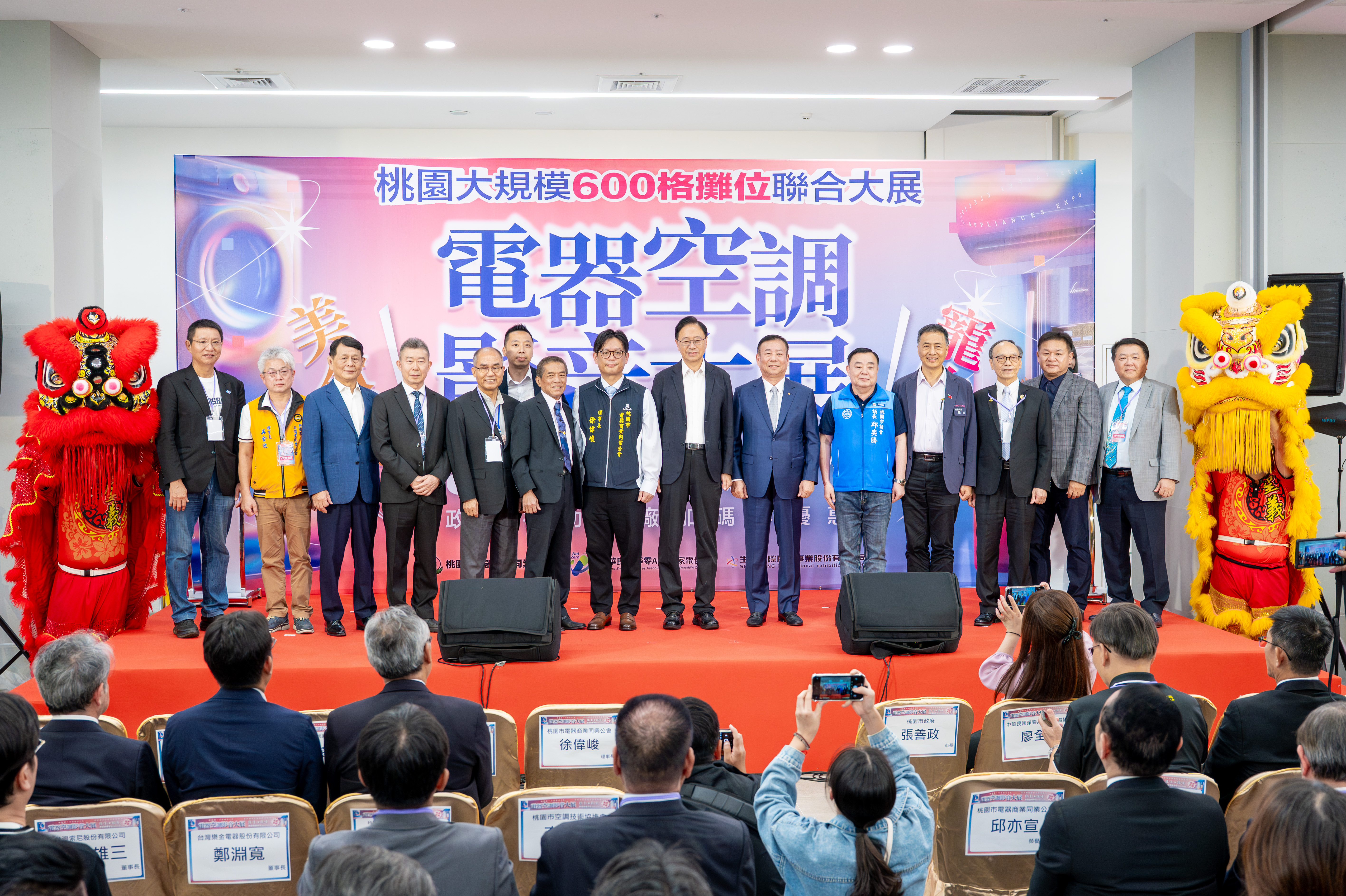 今日包括桃園市議會議長邱奕勝、市府經發局長張誠、國策顧問暨中華民國淨零AI智慧家電協會理事長廖全平、桃園市電器商業同業公會徐偉峻理事長、邱亦宣榮譽理事長、中華民國電器商業同業公會全國聯合會理事長蔡志亮、桃園市酒類商業同業公會理事長李連倉、桃園市茶商業同業公會理事長吳金池、桃園市AI茶產業發展協會理事長邱國雄、桃園市商業會理事長范揚淇、桃園市空調技術協進會理事長李傳璽等均一同出席。