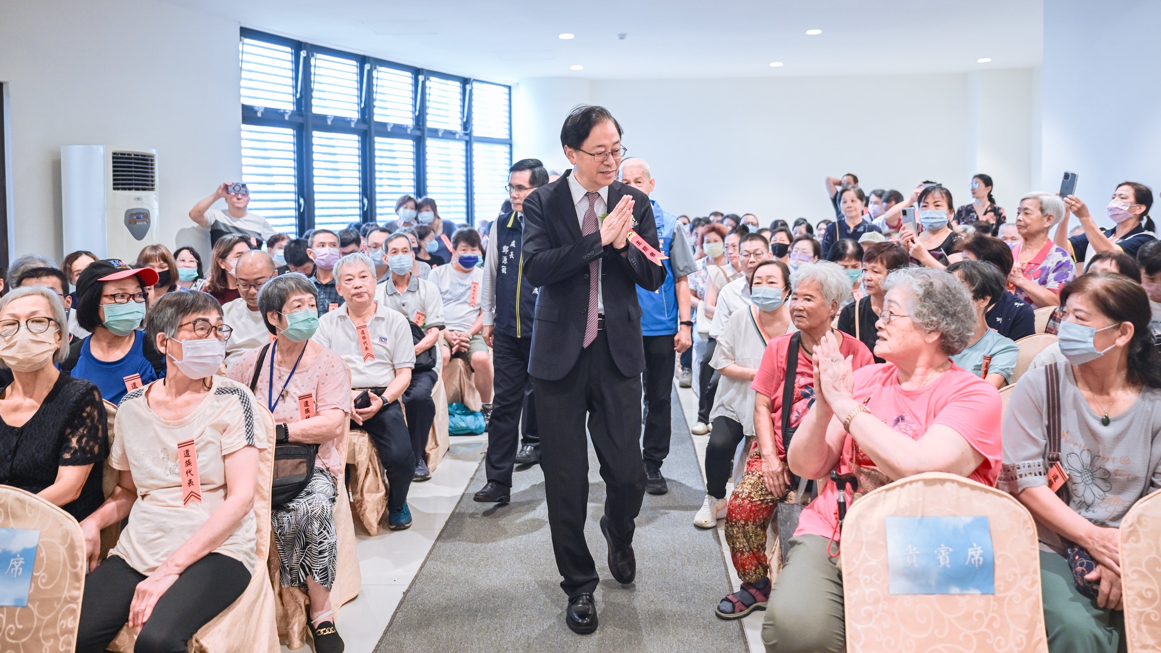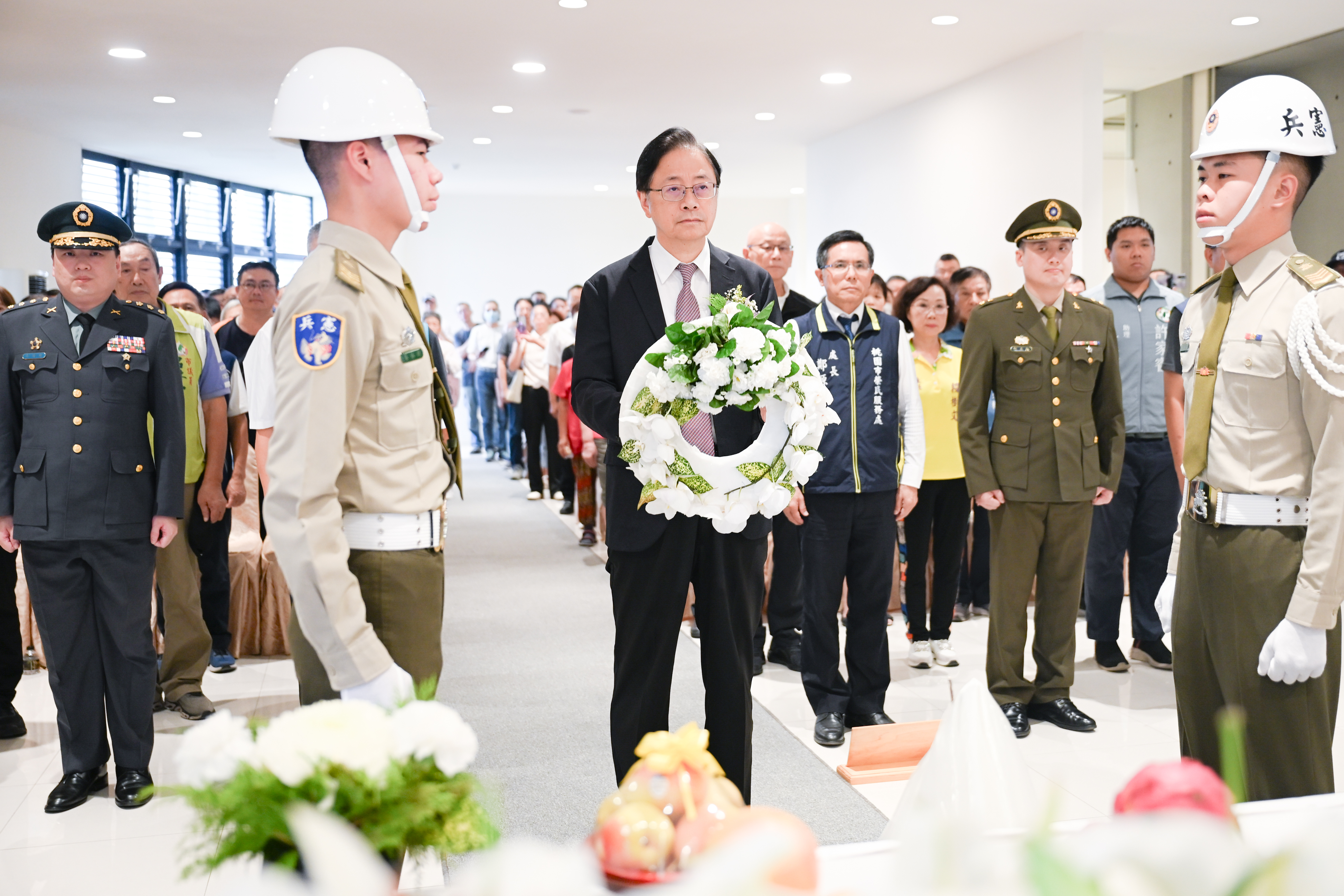 今日包括市府民政局副局長藍品畯、八德區長蔡豊展、桃園市後備指揮部指揮官蘇國棟、憲兵指揮部桃園憲兵隊副隊長何孟勳、桃園市榮民服務處長鄭源敏、桃園市軍人服務站幹事林文福、桃園榮譽國民之家主任陳平等均一同出席。