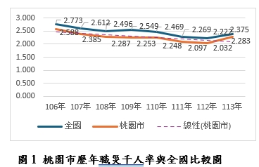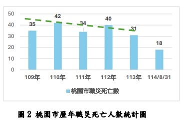 職場安全評估不宜僅以單一行業或事故型態為依據,而應觀察全行業職災千人率。依勞動部統計資料顯示,自106年至113年間,桃園市職災千人率持續下降,且均低於全國平均(如圖1),顯示本市降災策略已發揮成效。另依職災死亡人數觀察(如圖2),雖下降幅度有限,但仍呈現逐步改善趨勢。