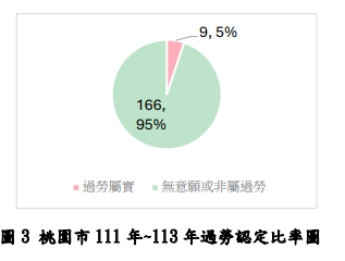 另所稱「疑似過勞案件」,係事業單位依法通報勞工於工作場所發生非設施設備導致之傷亡(如昏厥致休克或死亡等),因原因未明,暫列「疑似過勞」續處,並非確立為過勞案例。統計111年至113年,累計通報175件,其中166件(約95%)經調查屬「非過勞」、「非目標疾病」或「家屬無意願認定」,僅9件(約5%)經主管機關職安署認定屬「工作負荷過重」,且比例逐年下降(如圖3)。