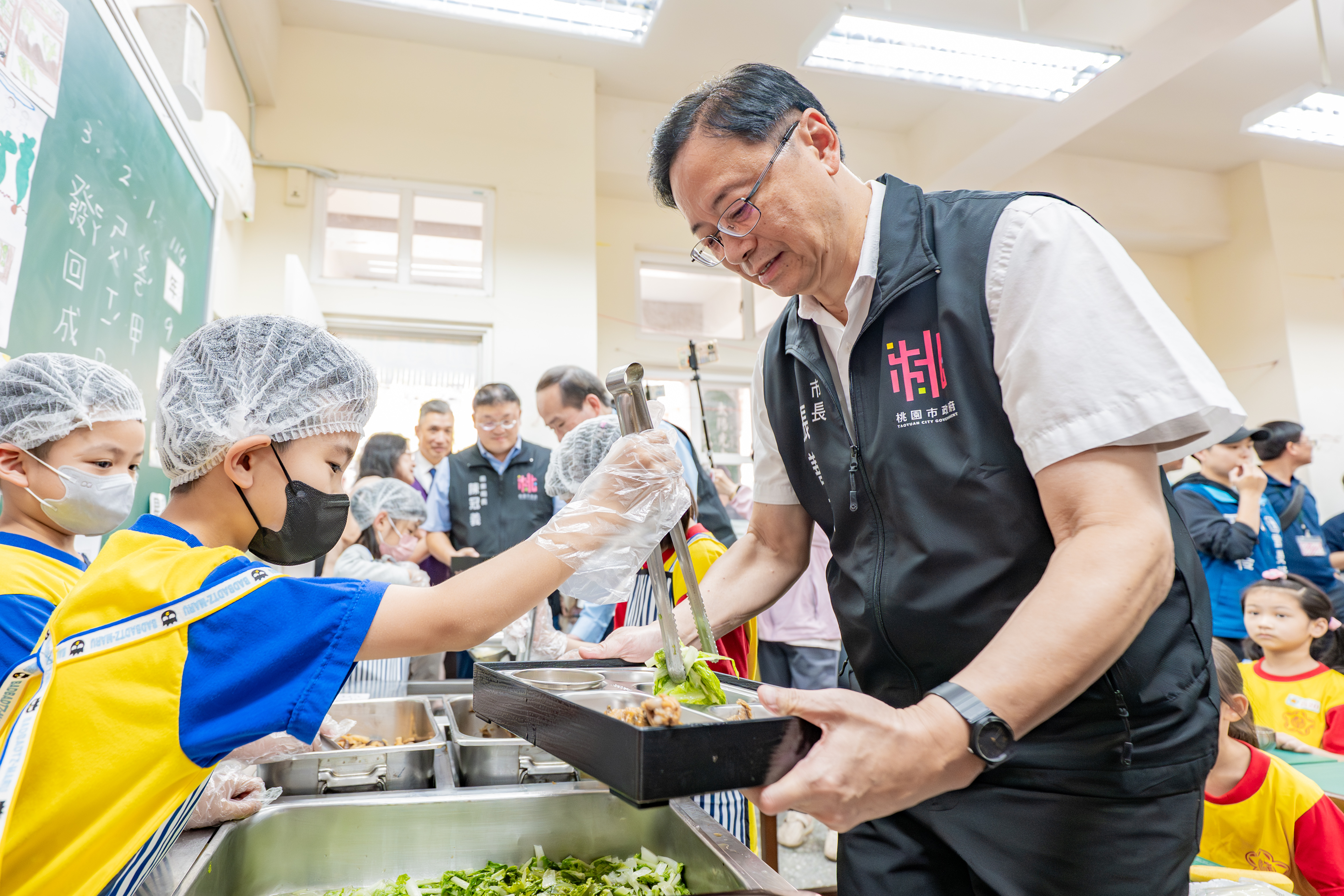 桃園市長張善政今(4)日中午前往龍潭區龍星國小,視察公私立國中小學生免費營養午餐。張市長表示,市府相當注重校園營養午餐品質,面對物價上漲,自114學年度起,每餐再增加3元補助,補助上限提升至51元,並堅守食安與在地食材兩大原則,嚴格把關供餐來源。